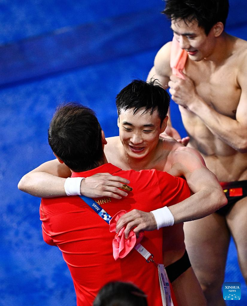 Cao Yuan (C) of China is congratulated after the men's 10m platform final of diving at the Paris 2024 Olympic Games in Saint-Denis, France, Aug. 10, 2024. (Xinhua/Wang Peng)