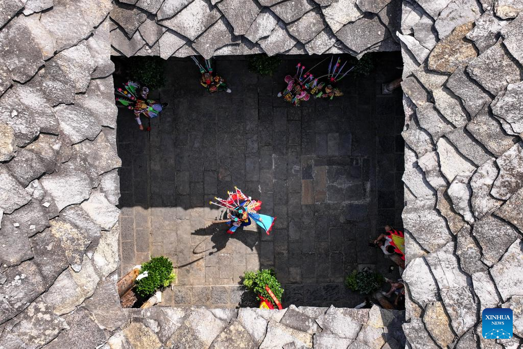 An aerial drone photo shows young Dixi opera enthusiasts staging a performance in Pingba District of Anshun City, southwest China's Guizhou Province, July 25, 2024. Anshun Dixi Opera is an important part of Tunpu culture dating back to the Ming Dynasty (1368-1644). The opera has been listed as one of the national intangible cultural heritages in 2006.