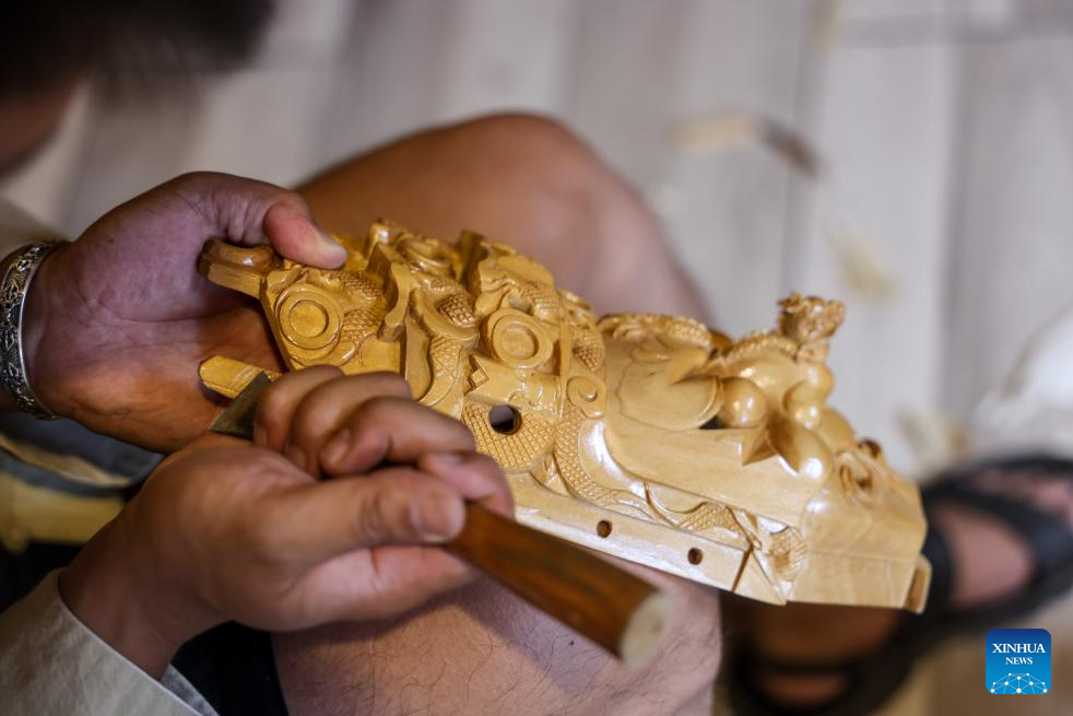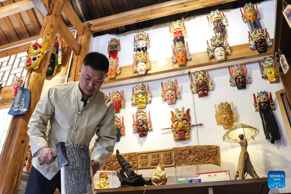 Bao Bo, an inheritor of Anshun woodcarving, makes a Dixi mask in Jiuzhou ancient town scenic area of Anshun City, southwest China's Guizhou Province, July 25, 2024. (Xinhua/Ou Dongqu)