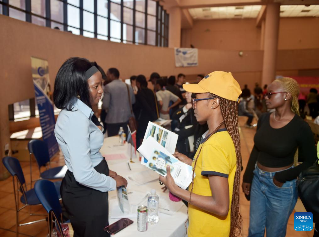 Local graduates talk with a staff member of a Chinese company at a job fair held in University of Botswana in Gaborone, Botswana, Aug. 9, 2024. Eight Chinese companies held a job fair in Botswana on Friday, attracting about 200 applicants from various universities.(Photo by Tshekiso Tebalo/Xinhua)