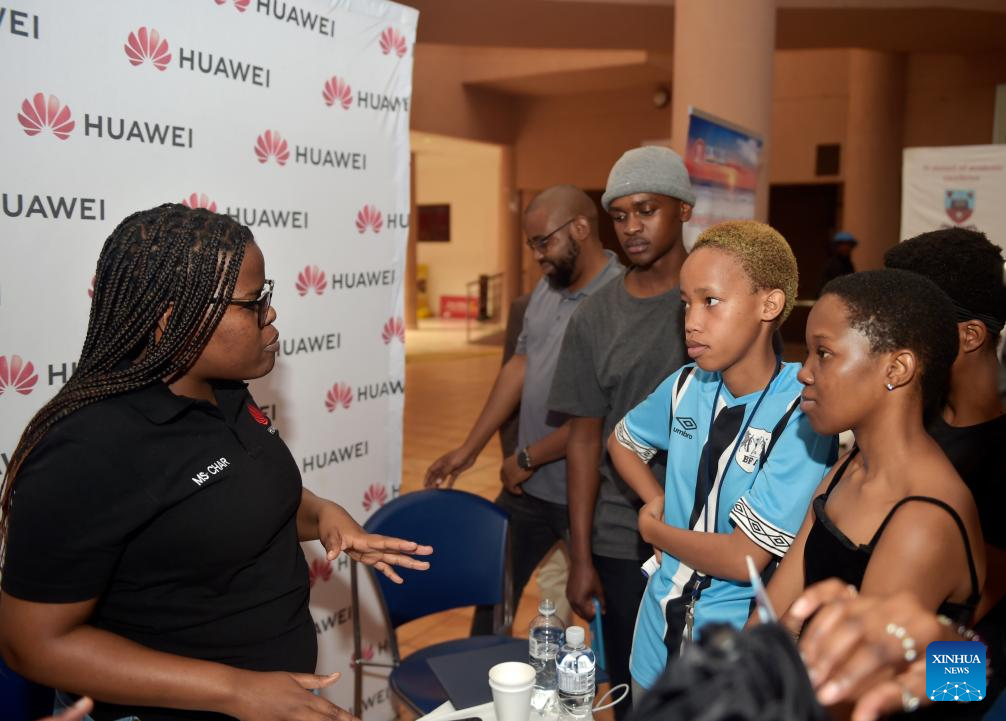 Local graduates talk with staff members of a Chinese company at a job fair held in University of Botswana in Gaborone, Botswana, Aug. 9, 2024. Eight Chinese companies held a job fair in Botswana on Friday, attracting about 200 applicants from various universities.(Photo by Tshekiso Tebalo/Xinhua)