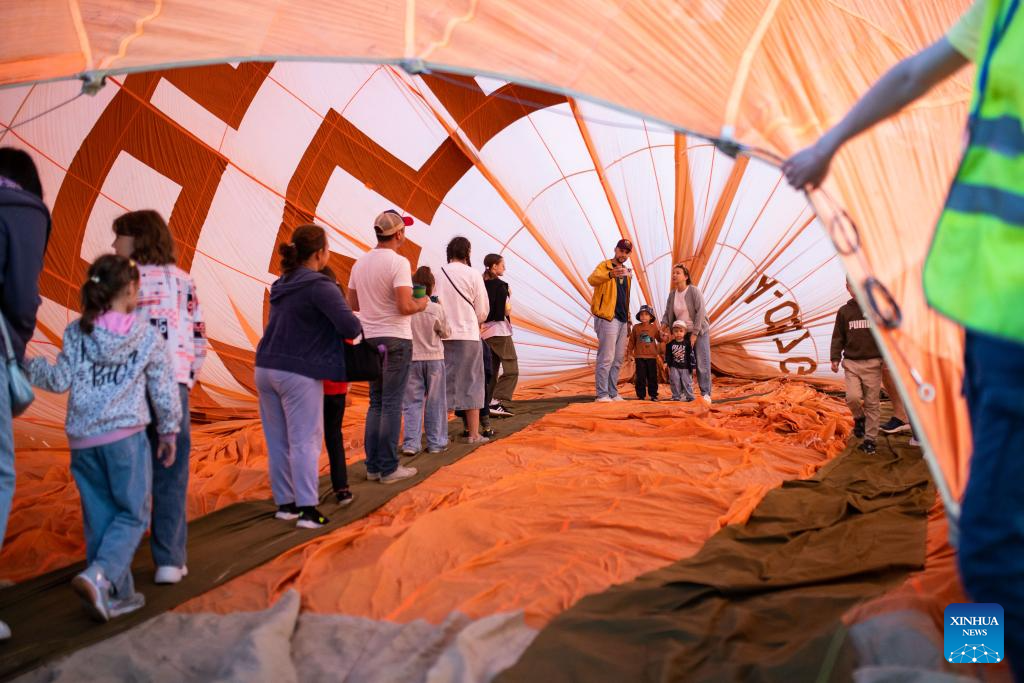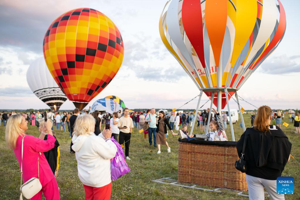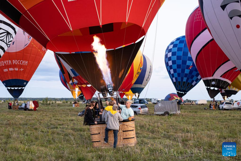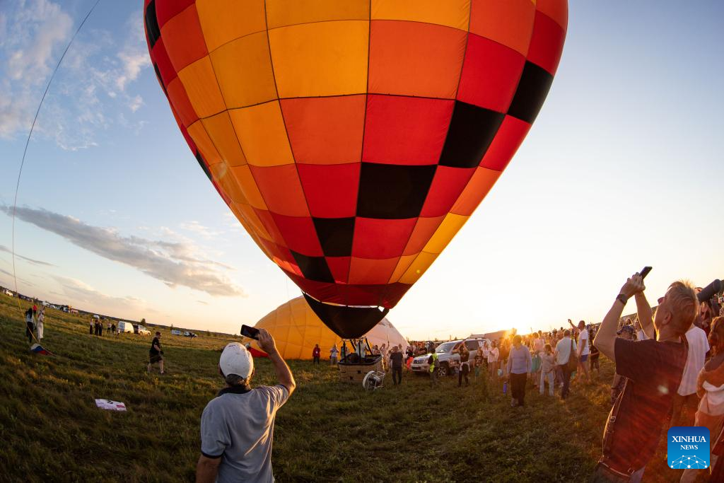 People visit the Sky of Russia hot-air balloon festival in Ryazan region, Russia, on Aug. 9, 2024. The 22nd ballooning festival "Sky of Russia" is held here from Aug. 4 to 12, and more than 30 teams are featured in the festival. (Xinhua/Bai Xueqi)