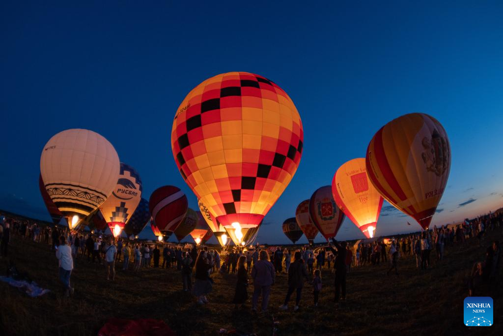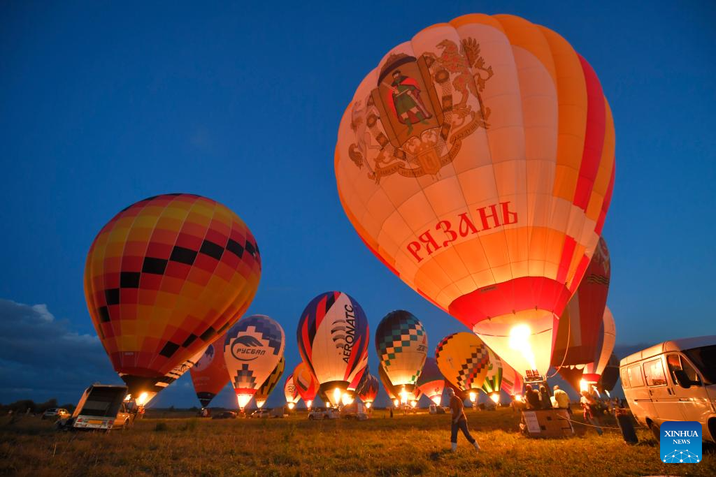 Hot-air balloons are illuminated during the Sky of Russia hot-air balloon festival in Ryazan region, Russia, on Aug. 9, 2024. The 22nd ballooning festival "Sky of Russia" is held here from Aug. 4 to 12, and more than 30 teams are featured in the festival. (Xinhua/Bai Xueqi)