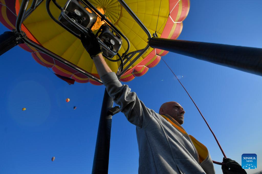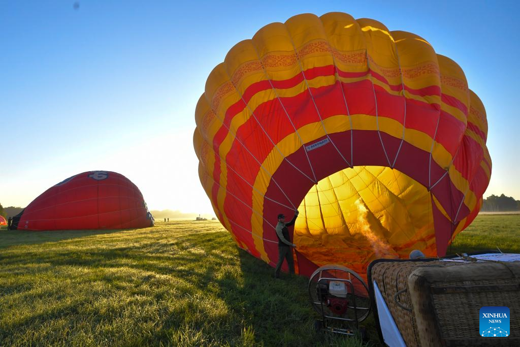 A participant prepares a hot-air balloon during the Sky of Russia hot-air balloon festival in Ryazan region, Russia, on Aug. 10, 2024. The 22nd ballooning festival "Sky of Russia" is held here from Aug. 4 to 12, and more than 30 teams are featured in the festival. (Photo by Alexander Zemlianichenko Jr/Xinhua)