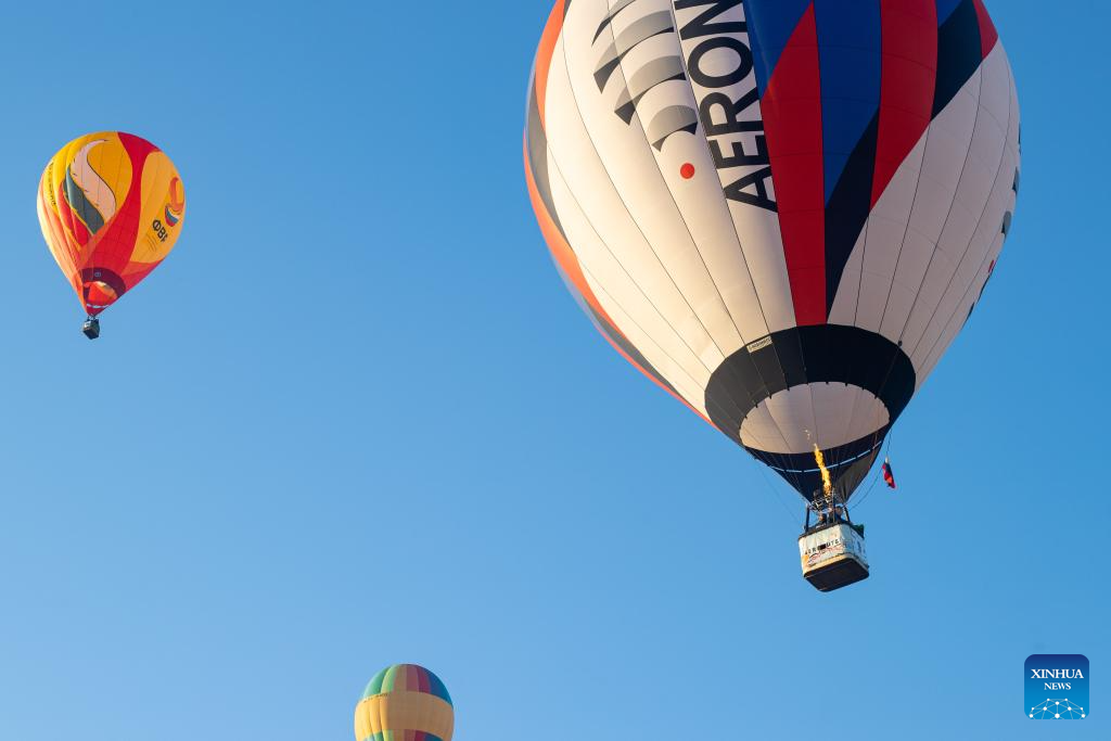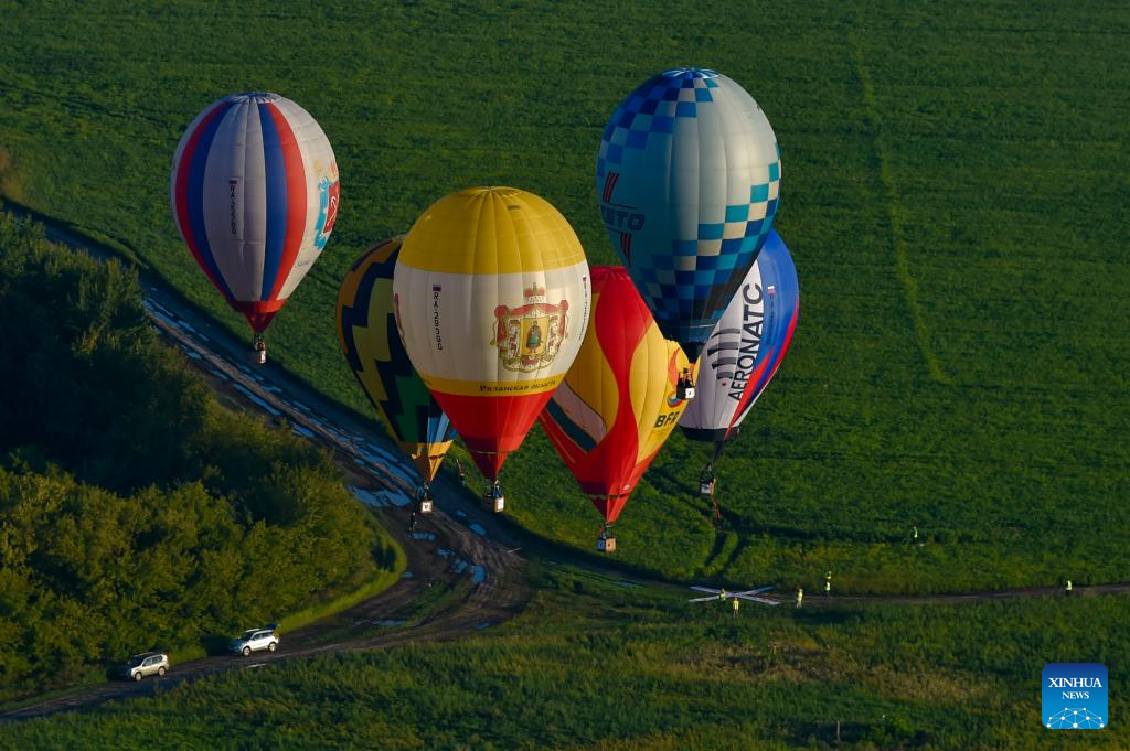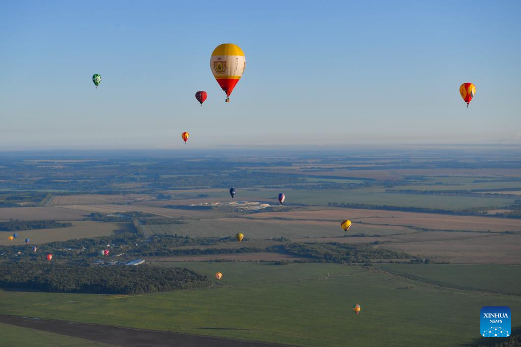Hot-air balloons fly during the Sky of Russia hot-air balloon festival in Ryazan region, Russia, on Aug. 10, 2024. The 22nd ballooning festival "Sky of Russia" is held here from Aug. 4 to 12, and more than 30 teams are featured in the festival. (Xinhua/Bai Xueqi)