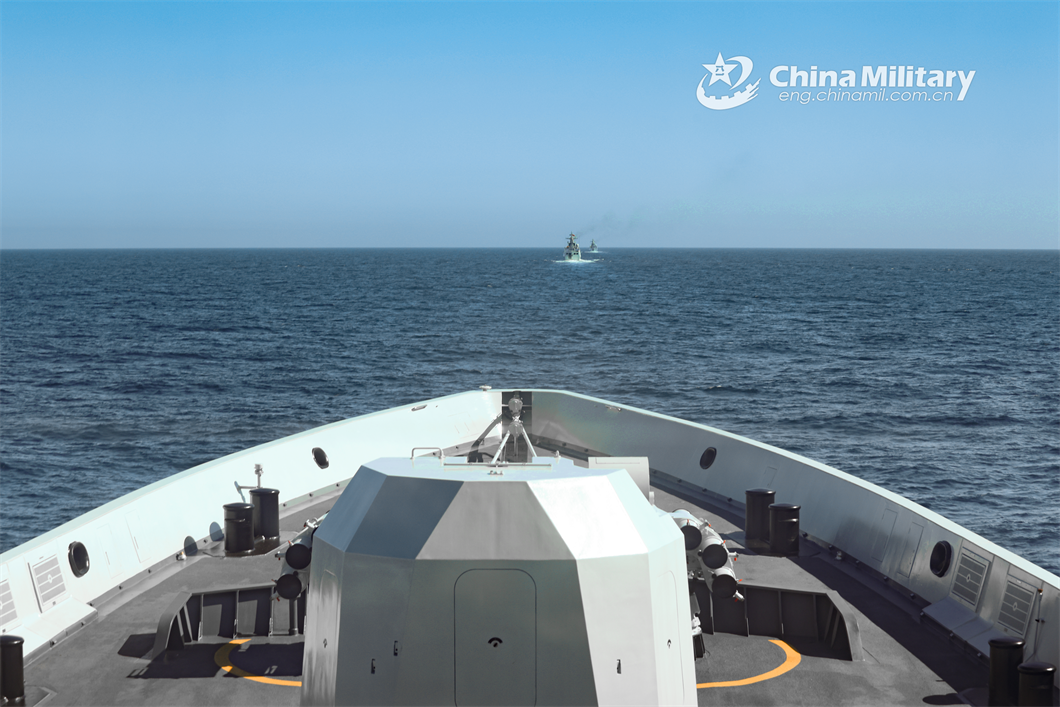 Vessels attached to a naval frigate flotilla under the PLA Eastern Theater Command sail in formation during a multi-subject training exercise on July 4, 2024. (eng.chinamil.com.cn/Photo by Liu Jia)