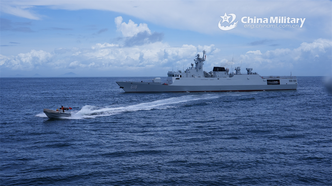 Type 056A corvette Shangqiu (Hull 618) attached to a naval frigate flotilla under the PLA Eastern Theater Command conducts visit, board, search and seizure (VBSS) operation during a multi-subject training exercise on July 4, 2024. (eng.chinamil.com.cn/Photo by Liu Jia)