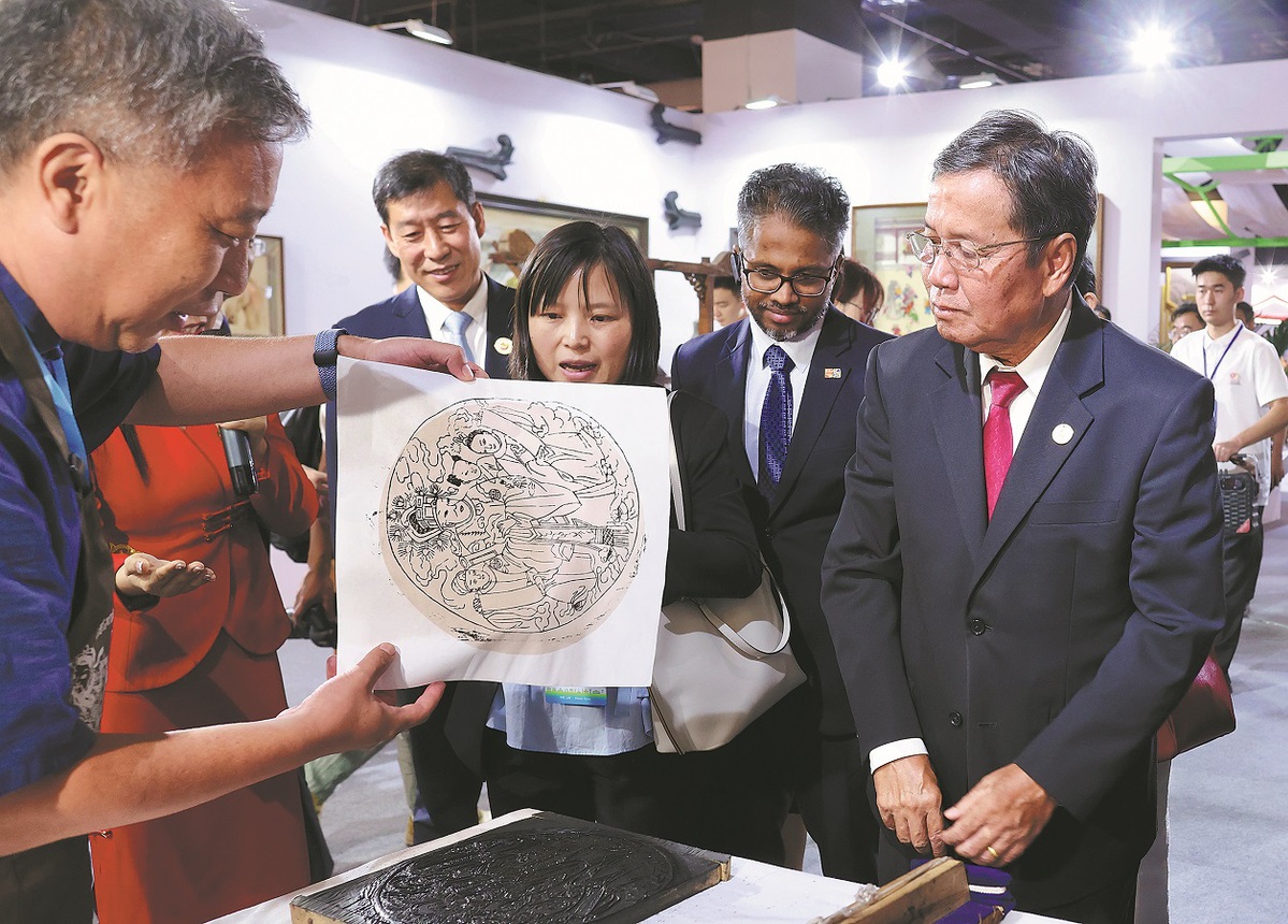 Khambay Damlath (right), vice-president of the Lao National Assembly, learns about New Year woodblock painting, which is listed as a national-level intangible cultural heritage item, in Changzhi, Shanxi province, on Aug 11, 2024. Damlath is on a visit to Changzhi to attend the ASEAN-China Week 2024, which will run through Thursday. (ZHU XINGXIN/CHINA DAILY)