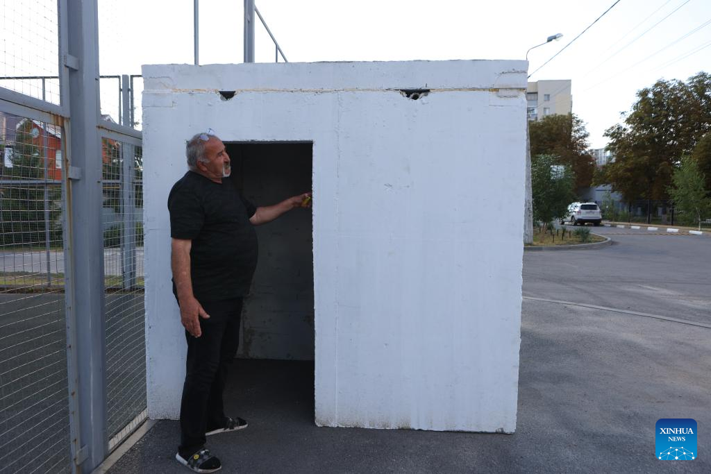 A man checks a modular double-reinforced concrete shelter, designed to protect civilians from shelling, in Belgorod, Russia, Aug. 9, 2024. (Xinhua)