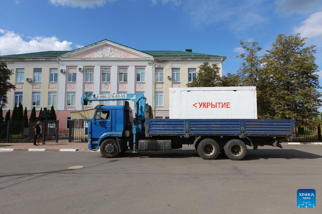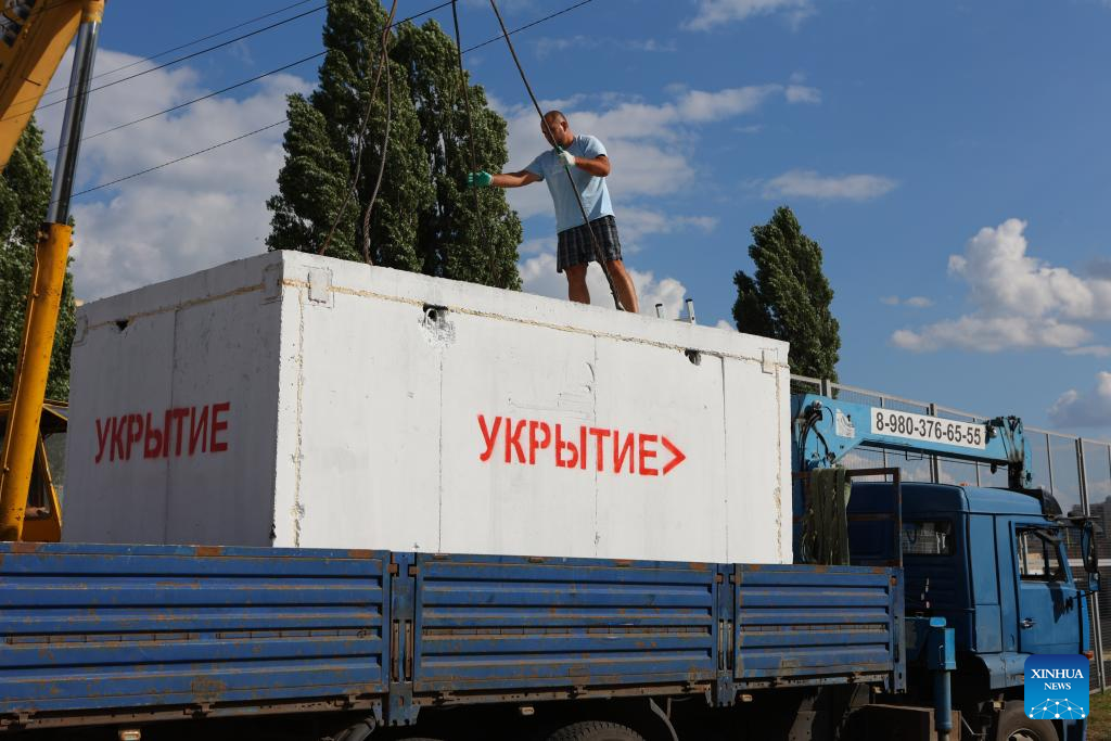 A lift truck carries a modular double-reinforced concrete shelter, designed to protect civilians from shelling, in Belgorod, Russia, Aug. 9, 2024. (Xinhua)