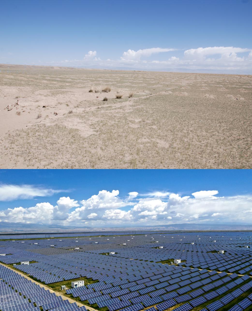 The combo photo shows a contrast between the past and present views of Talatan Gobi Desert in Hainan Tibetan Autonomous Prefecture, northwest China's Qinghai Province. (Photo courtesy of the publicity department of the Communist Party of China Hainan Tibetan Autonomous Prefecture committee)