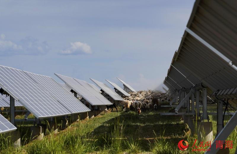 A flock of sheep leisurely roam a photovoltaic power industrial park in Hainan Tibetan Autonomous Prefecture, northwest China's Qinghai Province. (People's Daily Online/Gan Haiqiong)