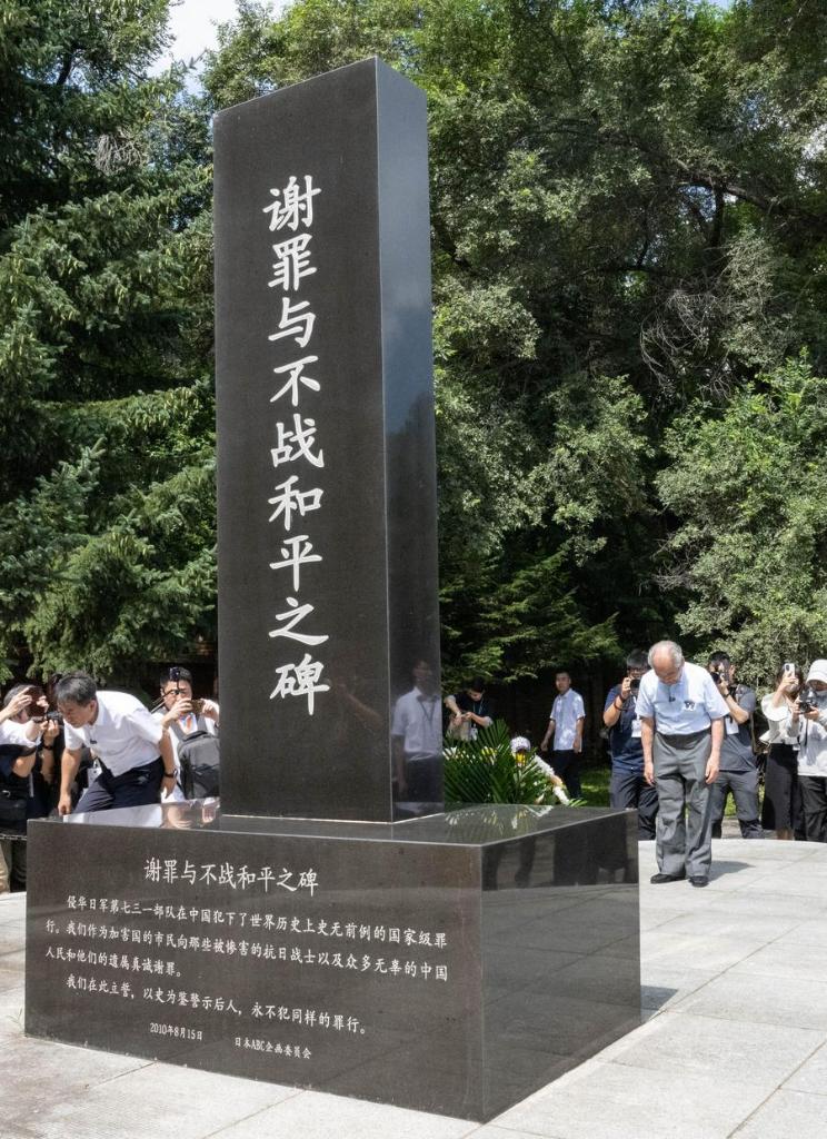 Hideo Shimizu offers an apology in front of an apology and anti-war monument at the former site of Unit 731 in Harbin, northeast China's Heilongjiang Province, Aug. 13, 2024. (Xinhua/Wang Jianwei)