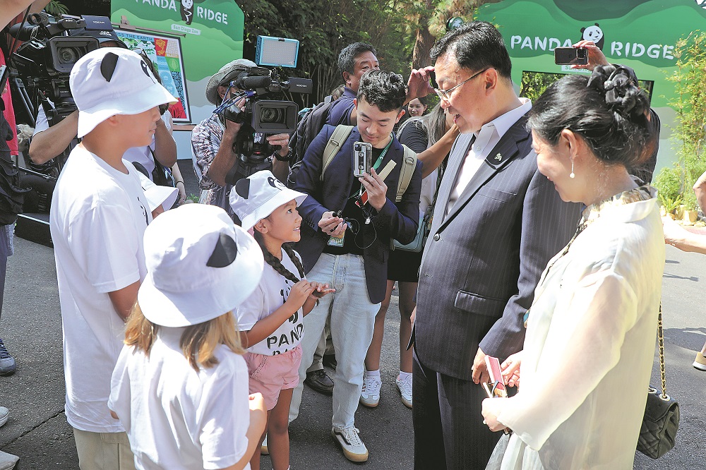 Chinese Ambassador to the United States Xie Feng speaks to visitors during the opening of Panda Ridge at the San Diego Zoo on Thursday. (LI ZHIWEI/PEOPLE'S DAILY)