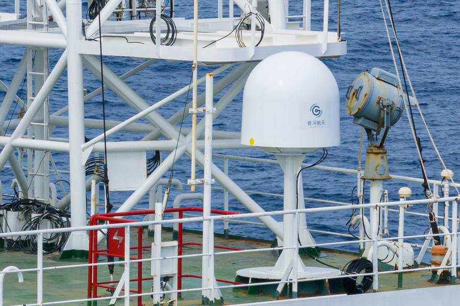This aerial photo taken on June 15, 2023 shows the internet terminal of low-Earth orbit satellites onboard the "Dian Ke No.1" comprehensive test ship. Researchers from the GalaxySpace, a Beijing-based satellite maker, and several scientific research institutions, conducted an open-sea testing of the country's first low-Earth orbit broadband communication test constellation in the South China Sea. (Xinhua)