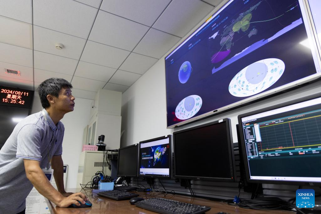 Xiong Shaolin checks the running status of the GECAM series space telescopes at the Institute of High Energy Physics (IHEP), Chinese Academy of Sciences, Beijing, capital of China, Aug. 11, 2024.