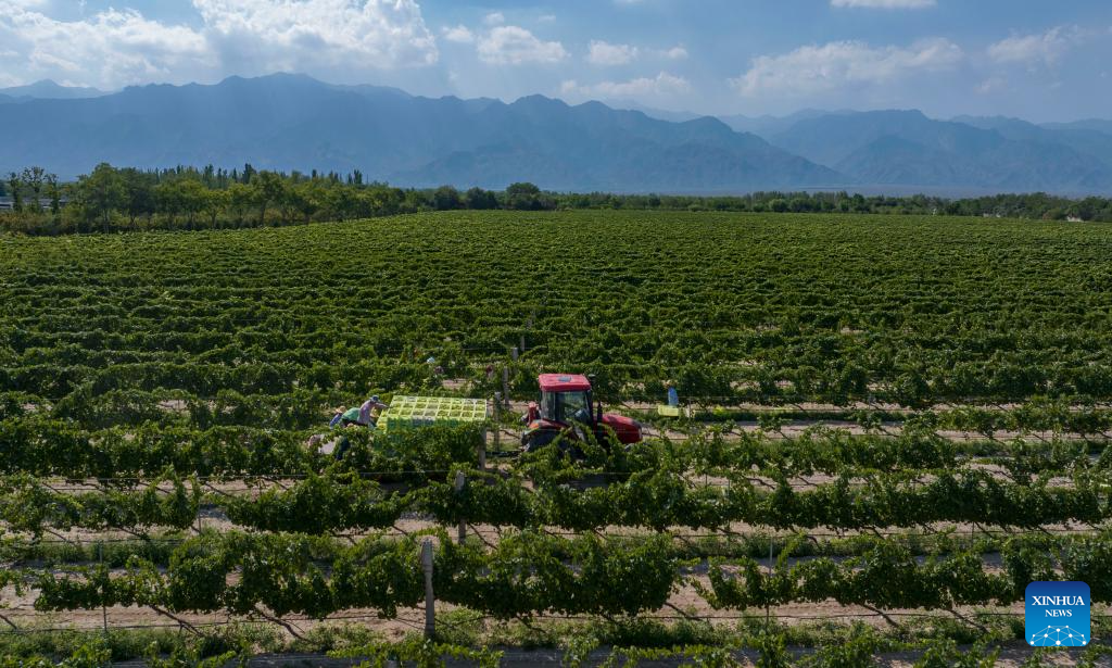 In this aerial drone photo, workers harvest white wine grapes in a vineyard at the eastern foot of Helan Mountain, northwest China's Ningxia Hui Autonomous Region, Aug. 12, 2024. The white wine grape harvest season here has started from the beginning of August. (Xinhua/Yang Zhisen)