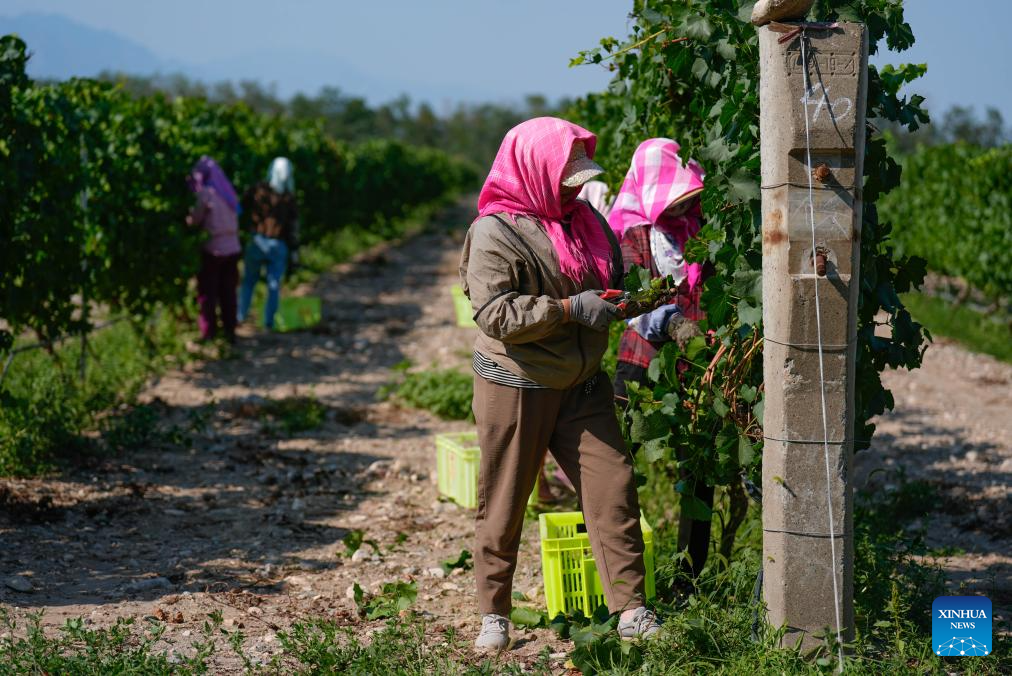 Workers harvest white wine grapes in a vineyard at the eastern foot of Helan Mountain, northwest China's Ningxia Hui Autonomous Region, Aug. 12, 2024. The white wine grape harvest season here has started from the beginning of August. (Xinhua/Yang Zhisen)