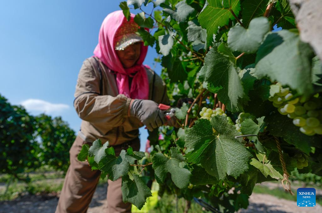 A worker harvests white wine grapes in a vineyard at the eastern foot of Helan Mountain, northwest China's Ningxia Hui Autonomous Region, Aug. 12, 2024. The white wine grape harvest season here has started from the beginning of August. (Xinhua/Yang Zhisen)