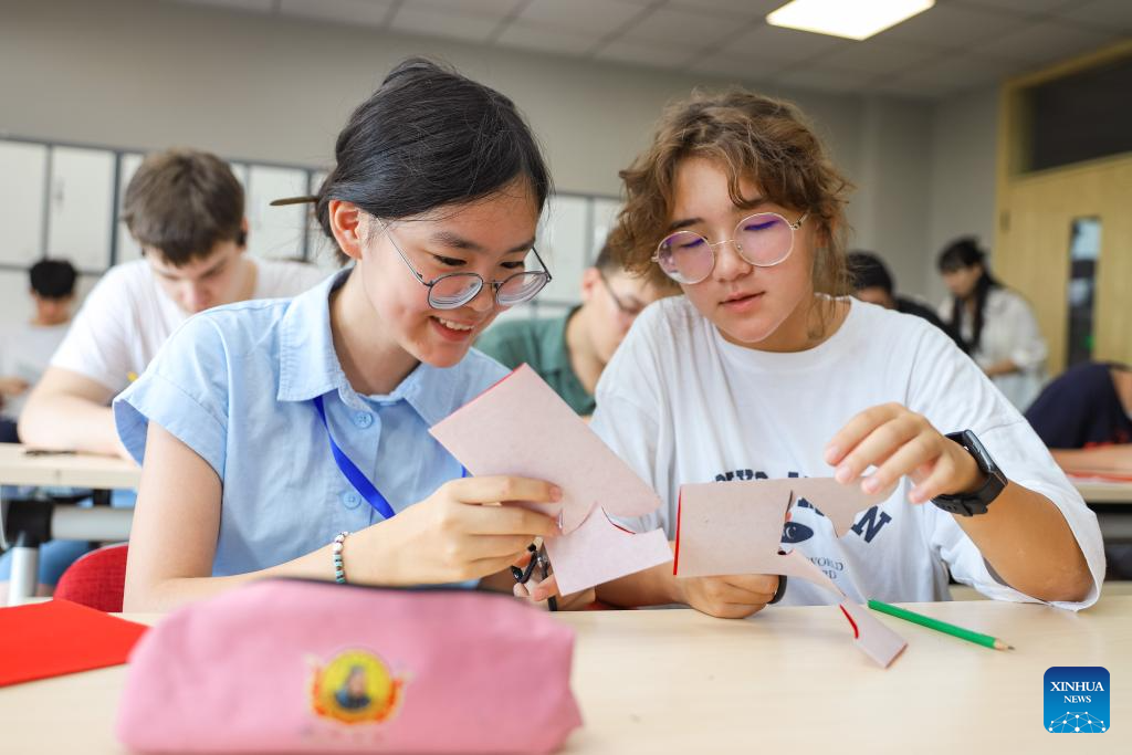 Chinese and Russian students make paper-cut works at Qingdao Hengxing University in Qingdao, east China's Shandong Province, Aug. 12, 2024.