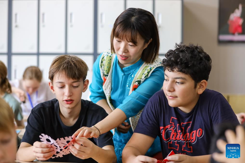 A teacher helps Russian students make paper-cut works at Qingdao Hengxing University in Qingdao, east China's Shandong Province, Aug. 12, 2024.