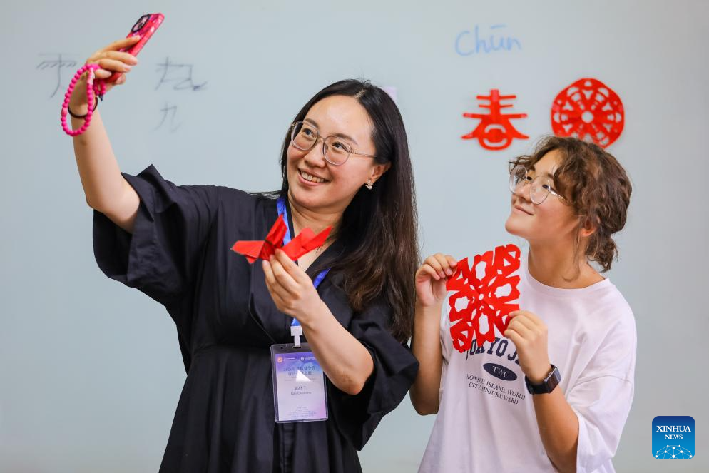 A Russian student shows her paper-cut work while posing for selfies with a Chinese teacher at Qingdao Hengxing University in Qingdao, east China's Shandong Province, Aug. 12, 2024.