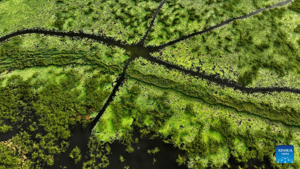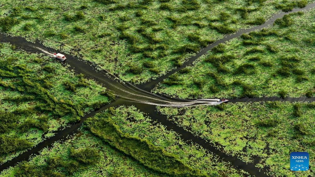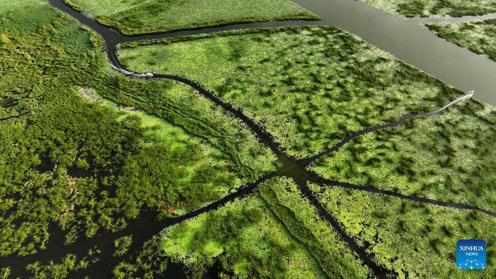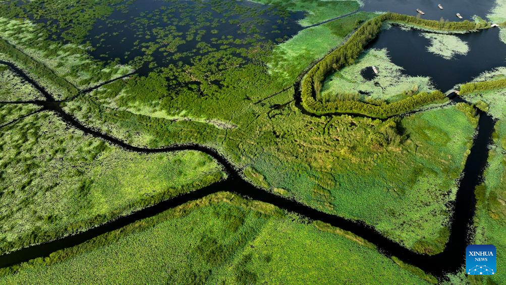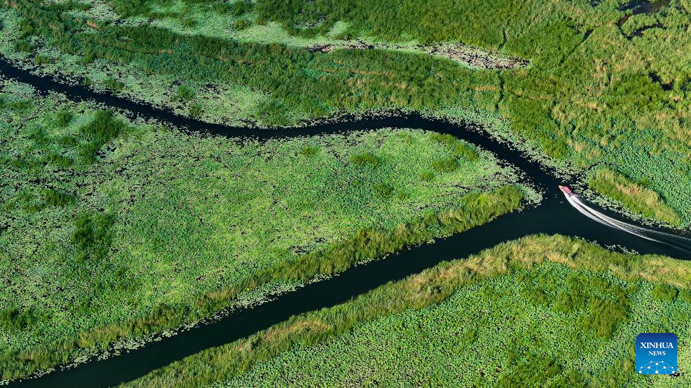 An aerial drone photo taken on Aug. 13, 2024 shows a wetland park in Weishan County in Jining City, east China's Shandong Province.