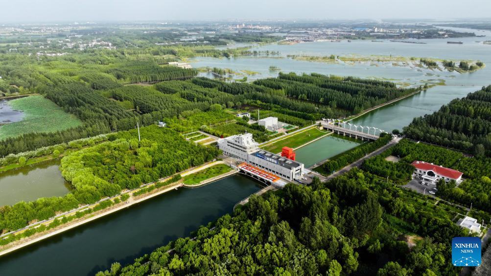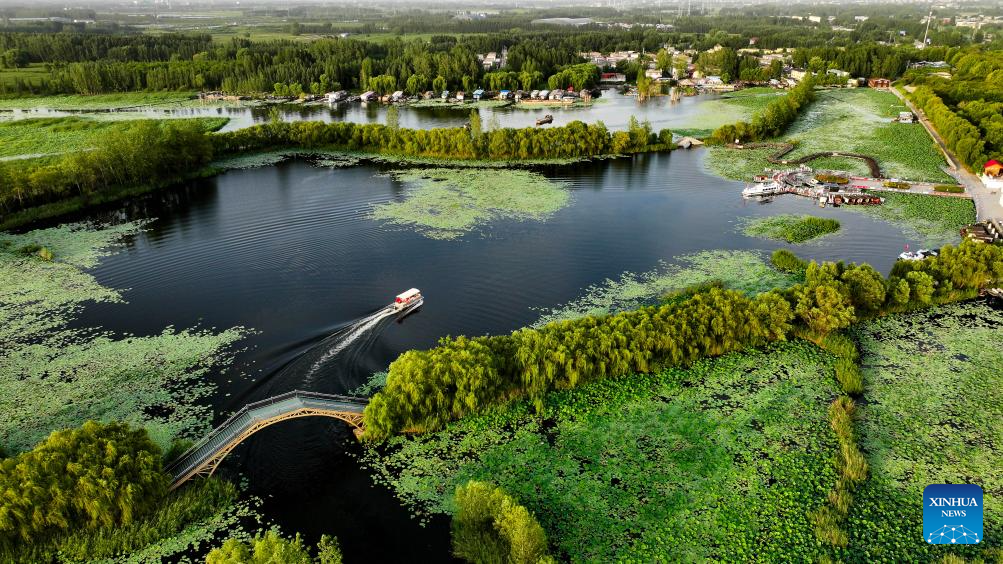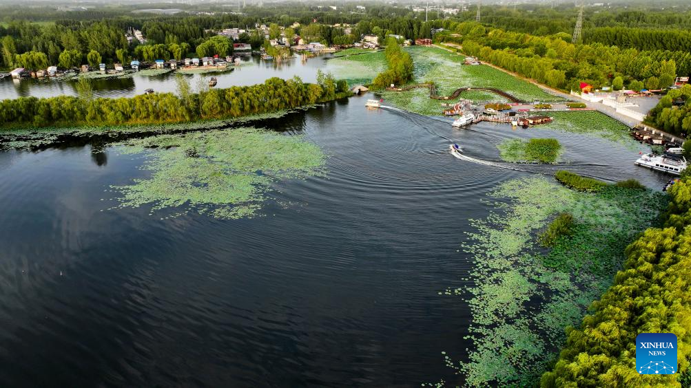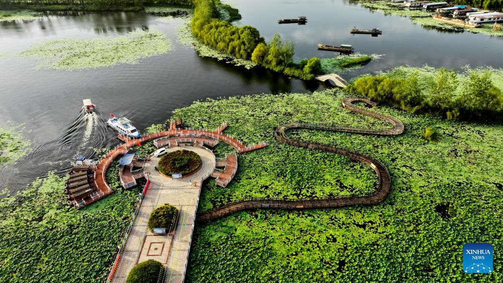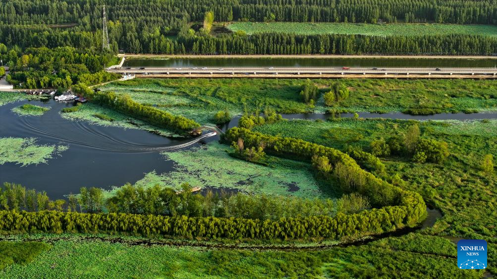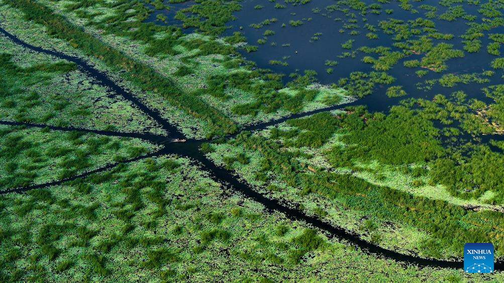 An aerial drone photo taken on Aug. 13, 2024 shows a wetland park in Weishan County in Jining City, east China's Shandong Province.