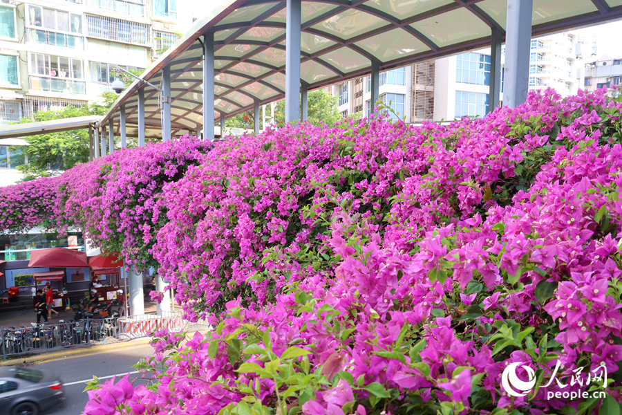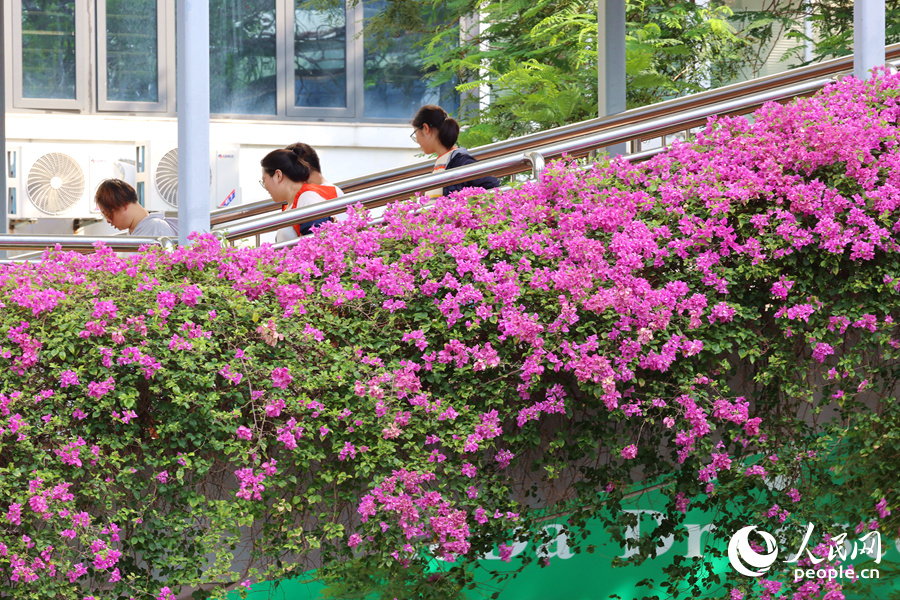 Bougainvillea flowers on a pedestrian bridge burst into bloom like a waterfall pouring down.(People's Daily Online/Chen Bo)