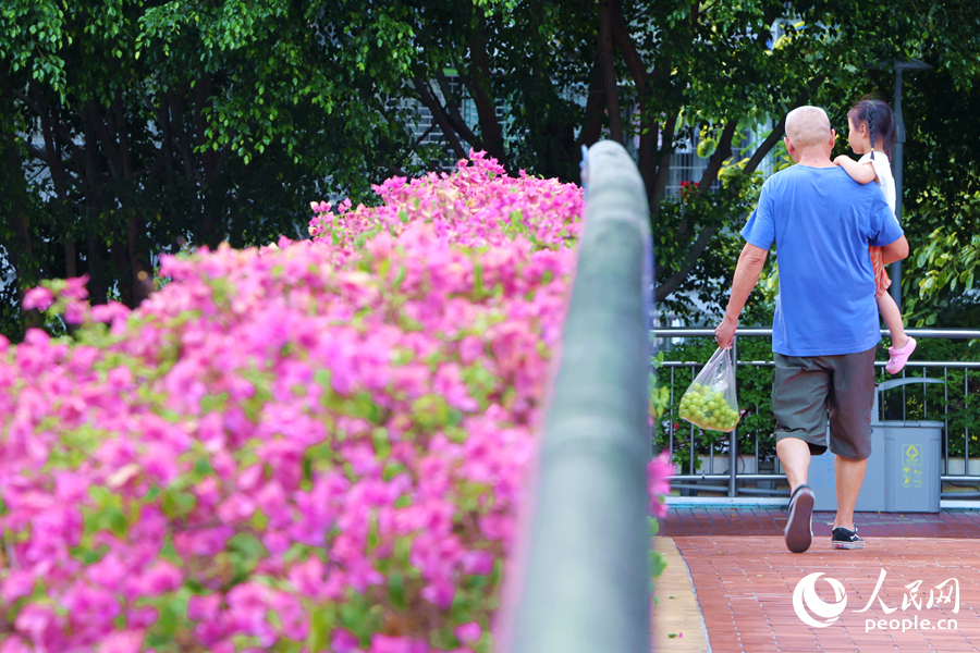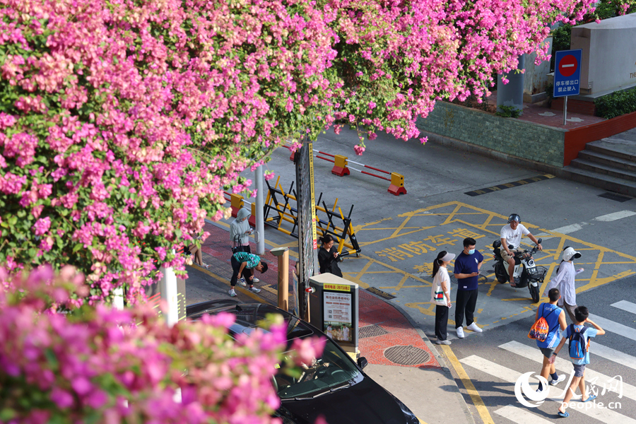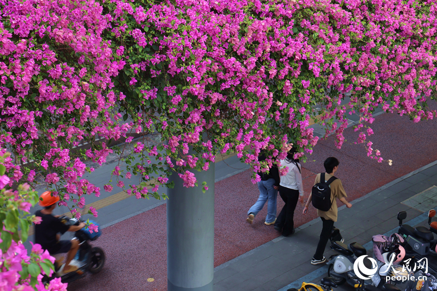 Pedestrians roam in the sea of bougainvillea flowers. (People's Daily Online/Chen Bo)