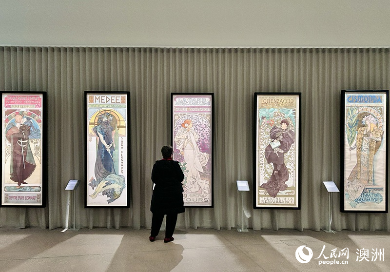 A visitor admires Mucha's works at the exhibition at the Art Gallery of New South Wales in Australia. (Photo/Bai Yuchen)
