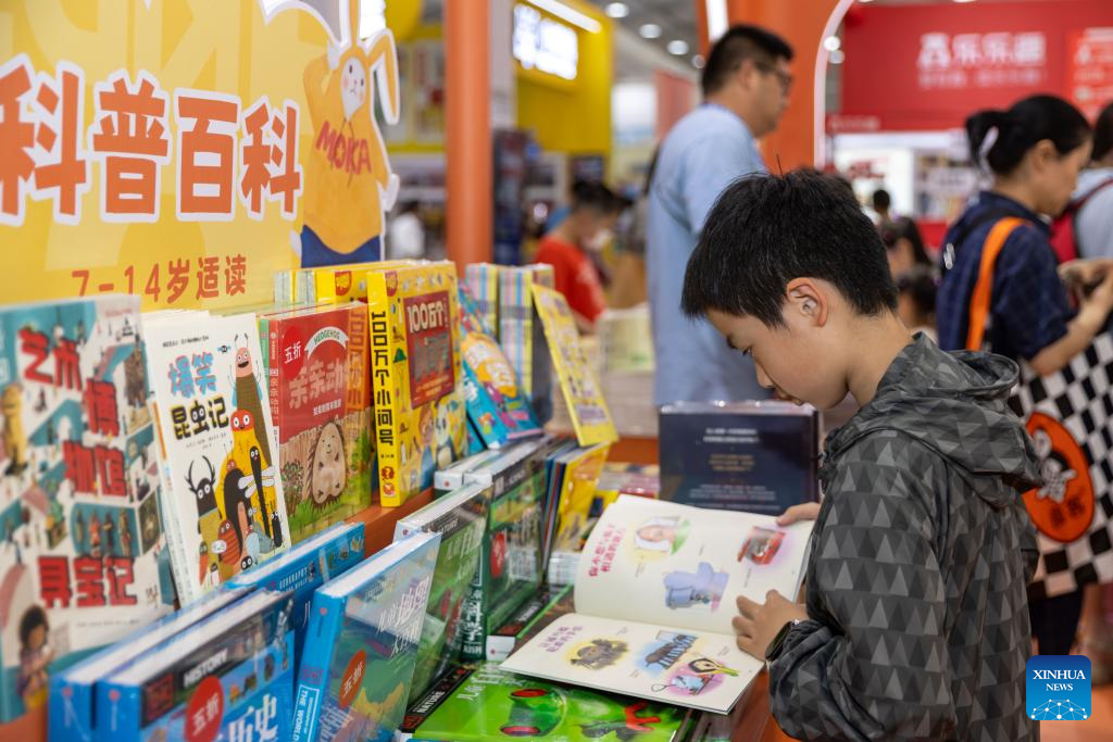 A boy reads during the 2024 Shanghai Book Fair in Shanghai, east China, Aug. 14, 2024. The book fair kicked off on Wednesday and will last until Aug. 20. (Xinhua/Wang Xiang)