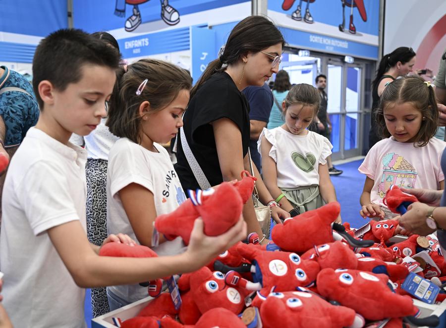 Customers purchase products of the Olympic Phryges mascots in the Paris 2024 official store on the Champs-Elysees Avenue in Paris, France, June 27, 2024. (Xinhua/He Changshan)