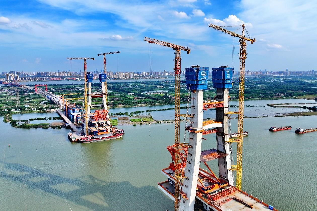 Upon completion, the Yangzizhou Ganjiang Highway-Railway Bridge will set a number of world records: it will become a highway-railway hybrid bridge with the most road lanes and largest capacity in the world, the world's largest-span highway-railway bridge supporting speeds up to 350 km/h, and the world's first harp-shaped cable-stayed bridge designed for trains running at 350 km/h.