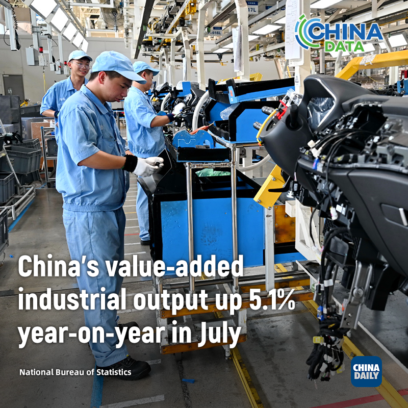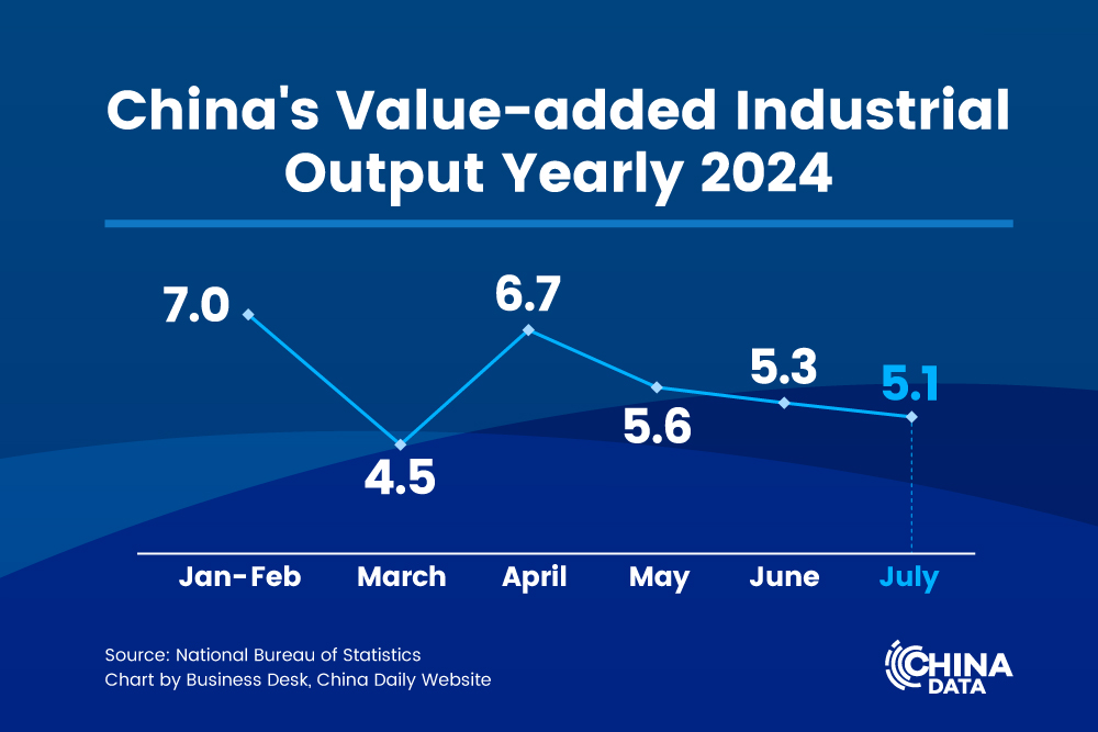 China's value-added industrial output, a gauge of activity in the manufacturing, mining, and utilities sectors, grew by 5.1 percent in July from a year earlier after a 5.3 percent rise in June.