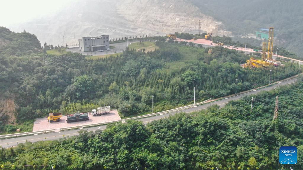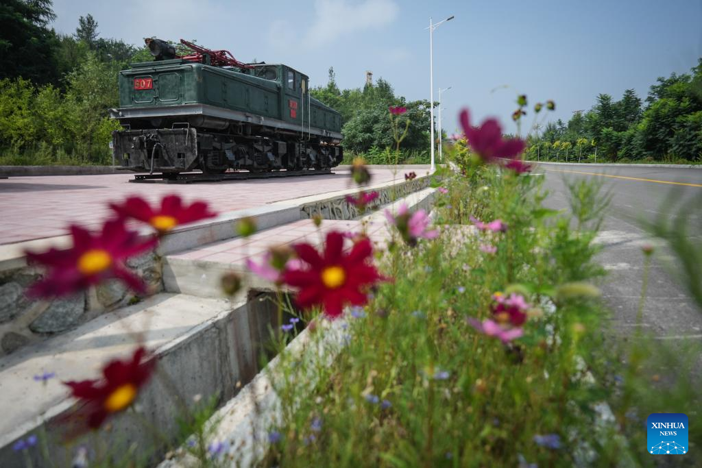 A worker mows the lawn at the Nanfen iron open-pit mine in Benxi, northeast China's Liaoning Province, Aug. 15, 2024. The Nanfen iron open-pit mine in northeast China's Liaoning Province in recent years has been making efforts to promote green and sustainable development. (Xinhua/Pan Yulong)