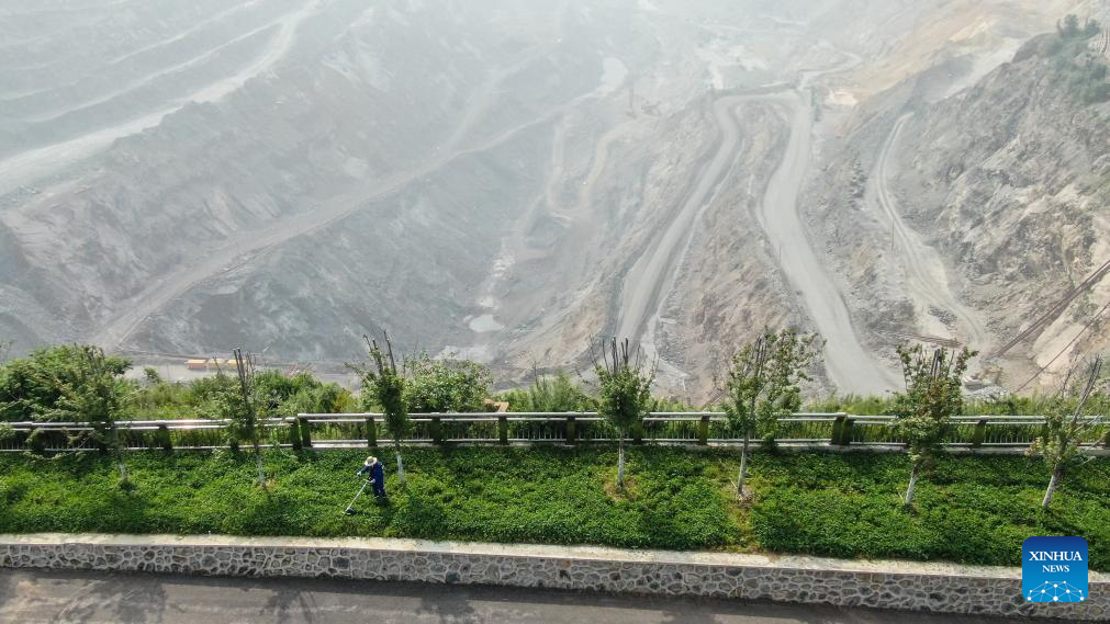 This aerial drone photo taken on Aug. 15, 2024 shows a worker mowing the lawn at the Nanfen iron open-pit mine in Benxi, northeast China's Liaoning Province. The Nanfen iron open-pit mine in northeast China's Liaoning Province in recent years has been making efforts to promote green and sustainable development. (Xinhua/Pan Yulong)
