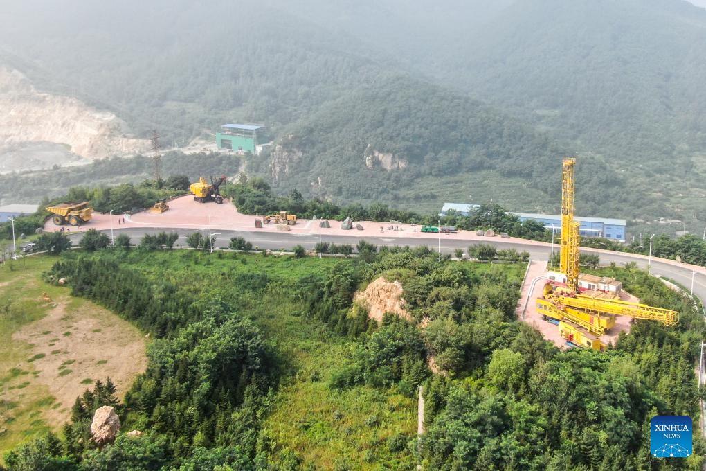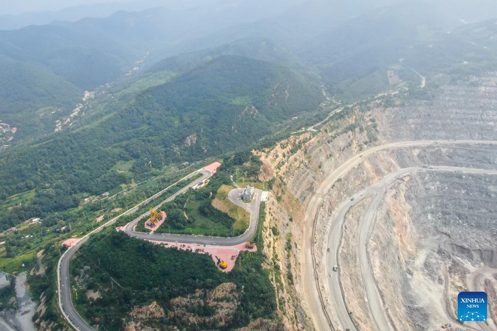 This aerial drone photo taken on Aug. 15, 2024 shows a part of the Nanfen iron open-pit mine, which has been transformed into a scenic spot in Benxi, northeast China's Liaoning Province. The Nanfen iron open-pit mine in northeast China's Liaoning Province in recent years has been making efforts to promote green and sustainable development. (Xinhua/Pan Yulong)