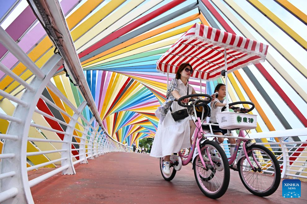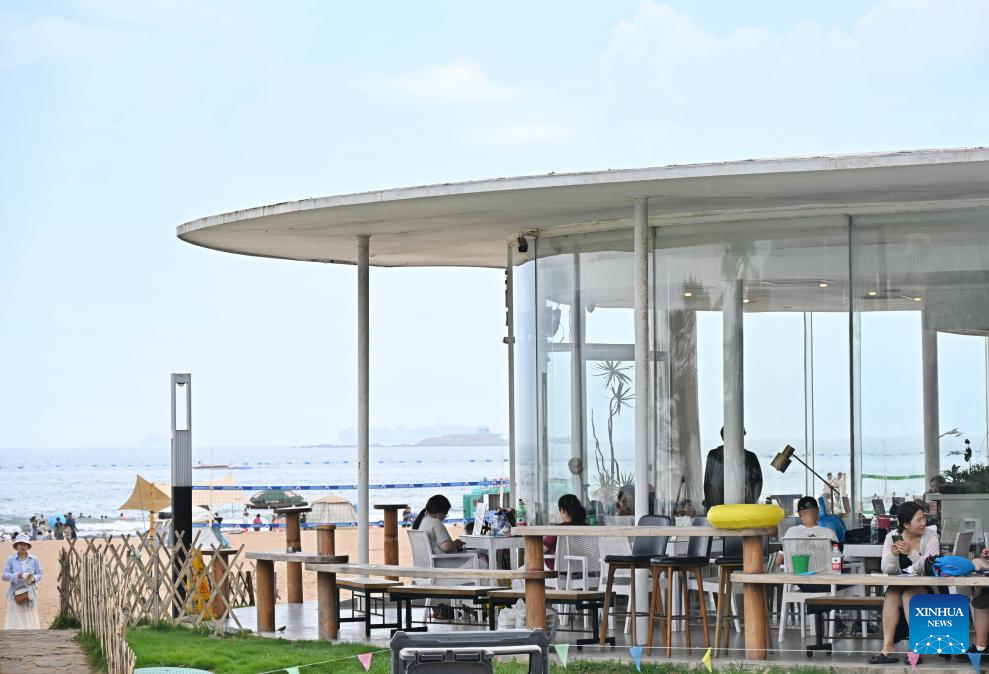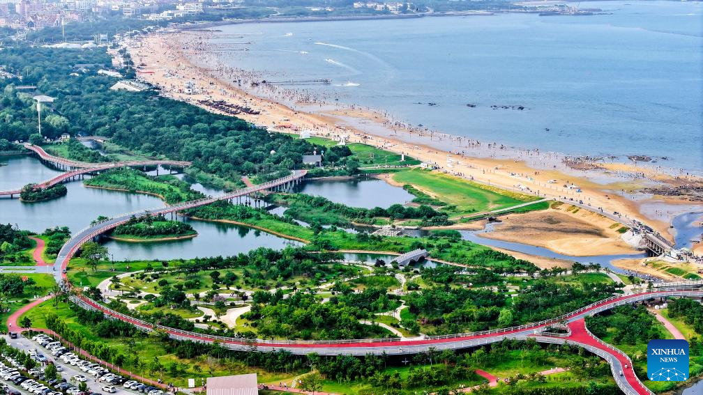 People visit a beach park in Qingdao City, east China's Shandong Province, Aug. 14, 2024. Shandong has been taking efforts in maritime ecological restoration in recent years. By restoring the inshore coastline and building cultural facilities such as reading rooms, the province has offered a better environment for local people. (Xinhua/Li Ziheng)