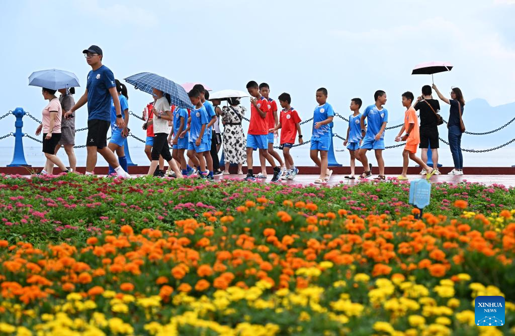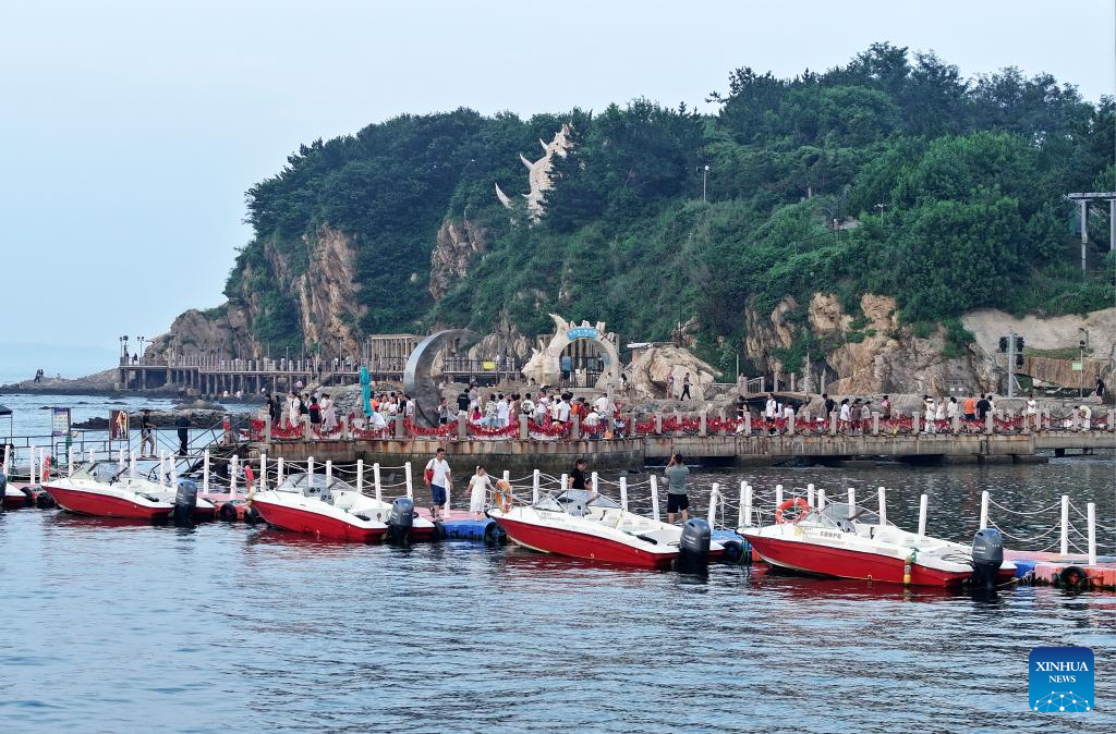 Tourists visit a scenic area in Yantai City, east China's Shandong Province, Aug. 13, 2024. Shandong has been taking efforts in maritime ecological restoration in recent years. By restoring the inshore coastline and building cultural facilities such as reading rooms, the province has offered a better environment for local people. (Xinhua/Li Ziheng)