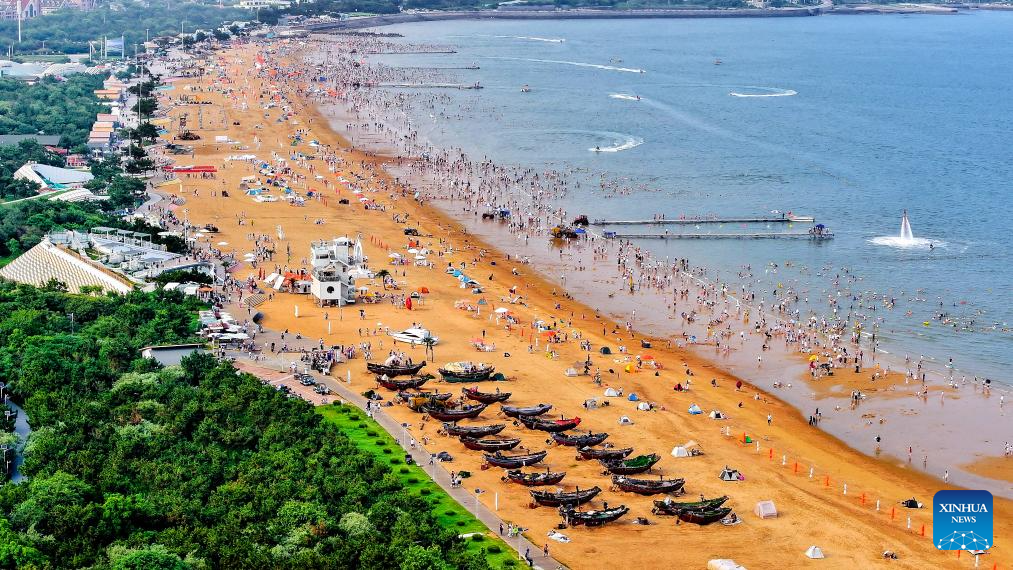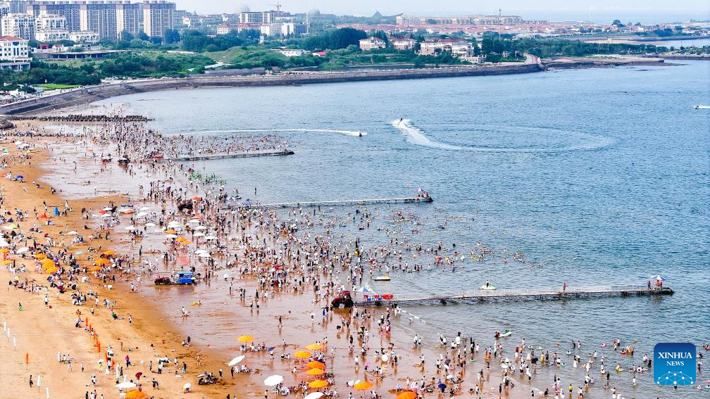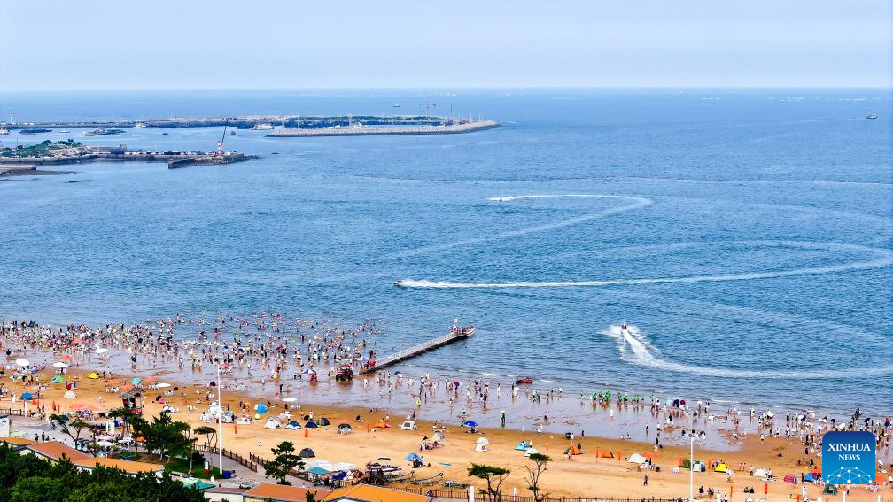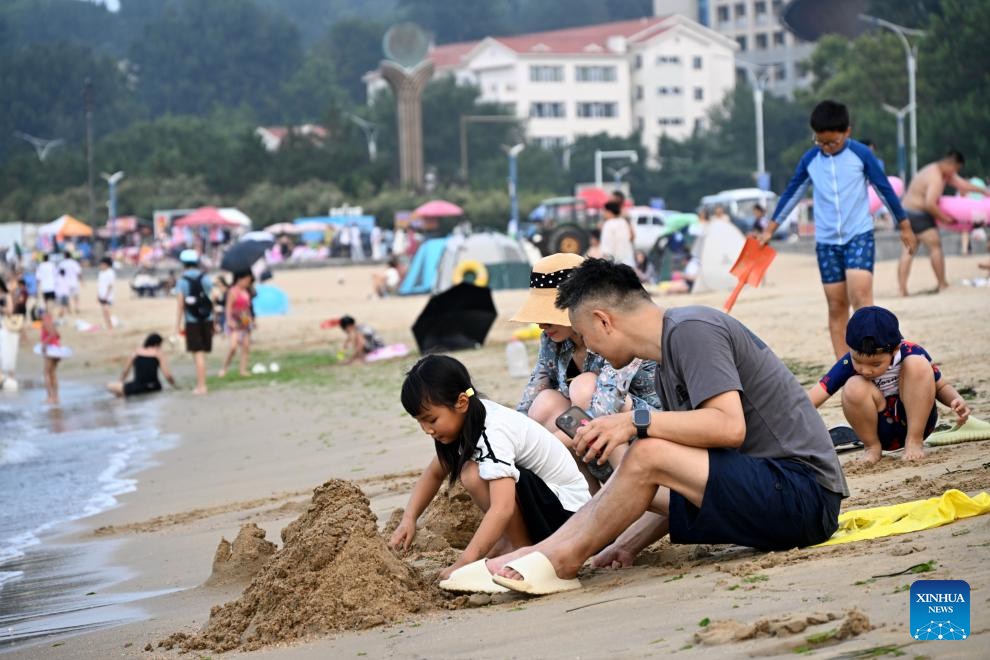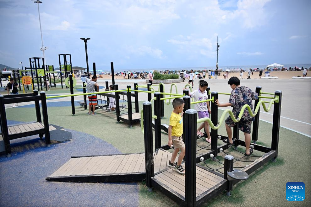 Tourists have fun at a beach in Yantai City, east China's Shandong Province, Aug. 13, 2024. Shandong has been taking efforts in maritime ecological restoration in recent years. By restoring the inshore coastline and building cultural facilities such as reading rooms, the province has offered a better environment for local people. (Xinhua/Li Ziheng)