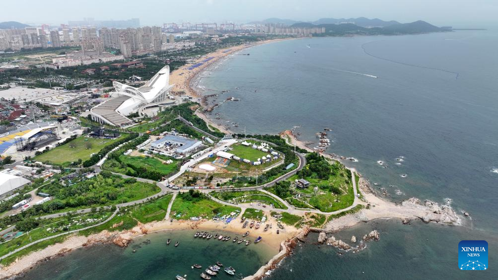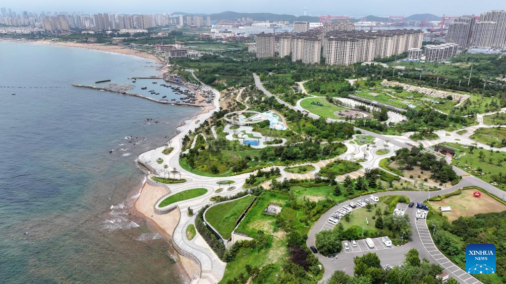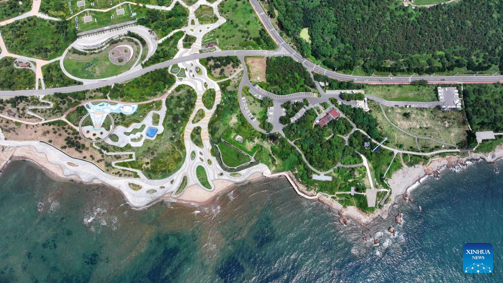 An aerial drone photo shows a beach park in Qingdao City, east China's Shandong Province, Aug. 14, 2024. Shandong has been taking efforts in maritime ecological restoration in recent years. By restoring the inshore coastline and building cultural facilities such as reading rooms, the province has offered a better environment for local people. (Xinhua/Li Ziheng)