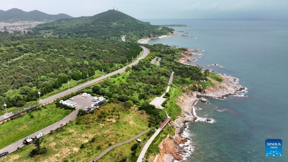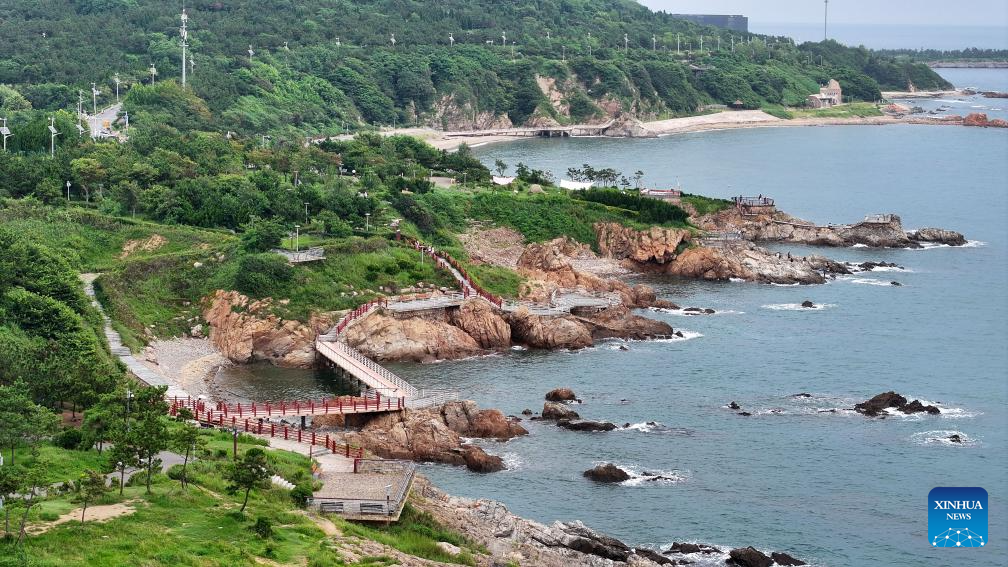 An aerial drone photo shows a pathway along the coastline at a scenic area in Yantai City, east China's Shandong Province, Aug. 13, 2024. Shandong has been taking efforts in maritime ecological restoration in recent years. By restoring the inshore coastline and building cultural facilities such as reading rooms, the province has offered a better environment for local people. (Xinhua/Li Ziheng)