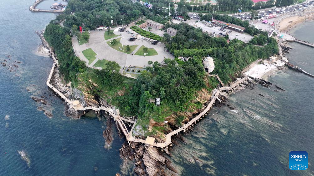 An aerial drone photo shows a pathway along the coastline in Qingdao City, east China's Shandong Province, Aug. 14, 2024. Shandong has been taking efforts in maritime ecological restoration in recent years. By restoring the inshore coastline and building cultural facilities such as reading rooms, the province has offered a better environment for local people. (Xinhua/Li Ziheng)