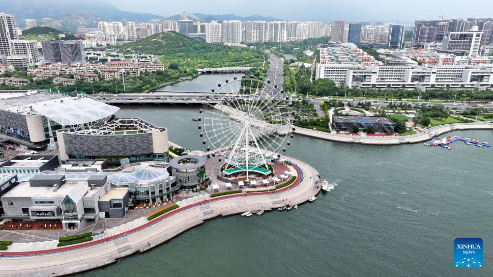 An aerial drone photo shows an island in Qingdao City, east China's Shandong Province, Aug. 14, 2024. Shandong has been taking efforts in maritime ecological restoration in recent years. By restoring the inshore coastline and building cultural facilities such as reading rooms, the province has offered a better environment for local people. (Xinhua/Li Ziheng)