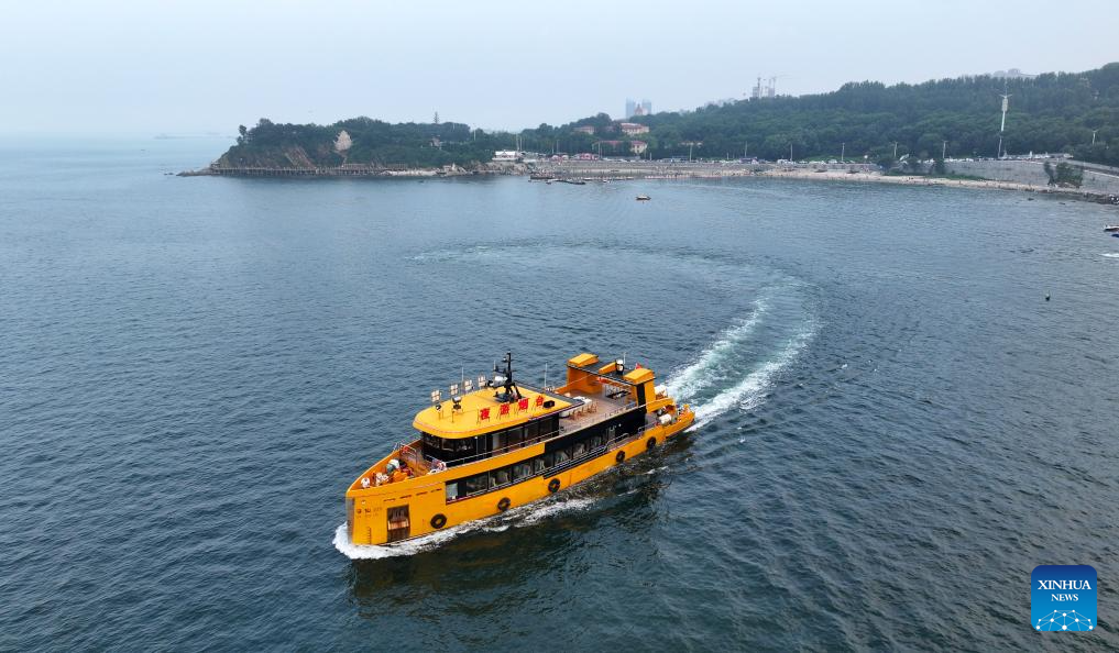 A boat sails in Yantai City, east China's Shandong Province, Aug. 13, 2024. Shandong has been taking efforts in maritime ecological restoration in recent years. By restoring the inshore coastline and building cultural facilities such as reading rooms, the province has offered a better environment for local people. (Xinhua/Li Ziheng)