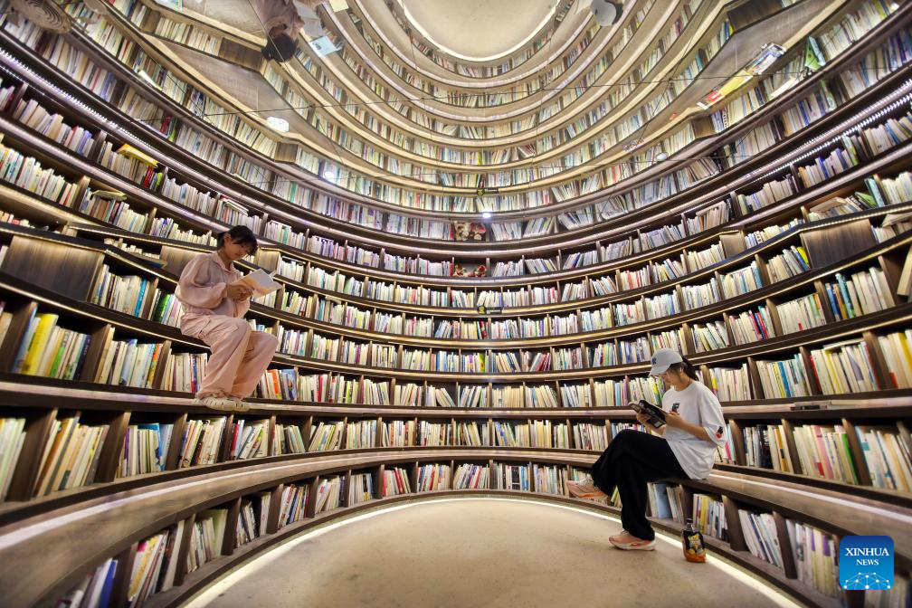 People enjoy themselves at a bookstore by the beach in Qingdao City, east China's Shandong Province, Aug. 14, 2024. Shandong has been taking efforts in maritime ecological restoration in recent years. By restoring the inshore coastline and building cultural facilities such as reading rooms, the province has offered a better environment for local people. (Xinhua/Li Ziheng)