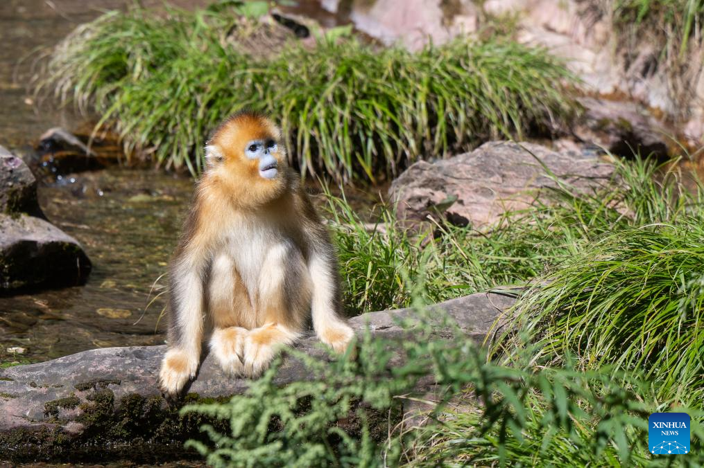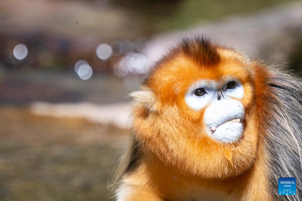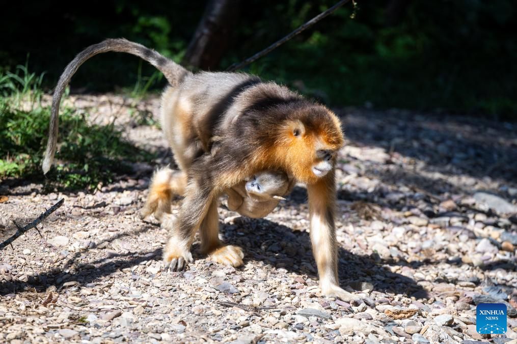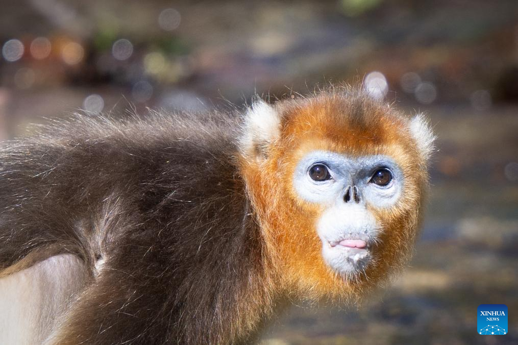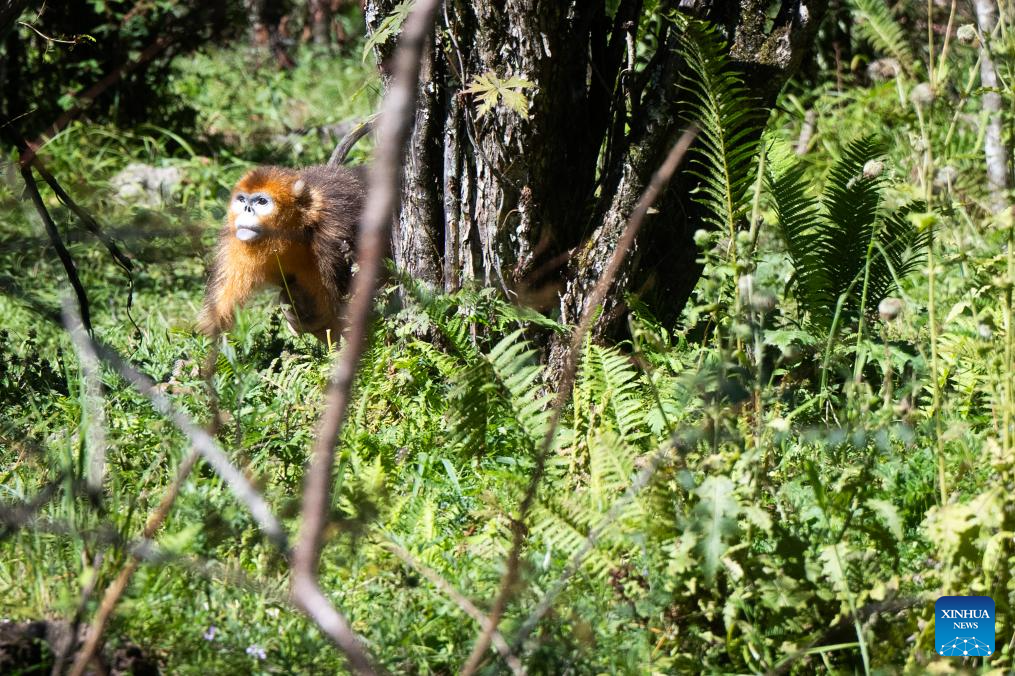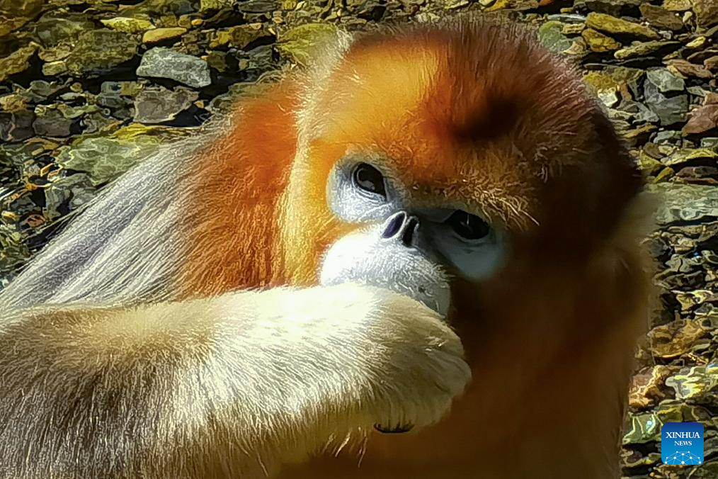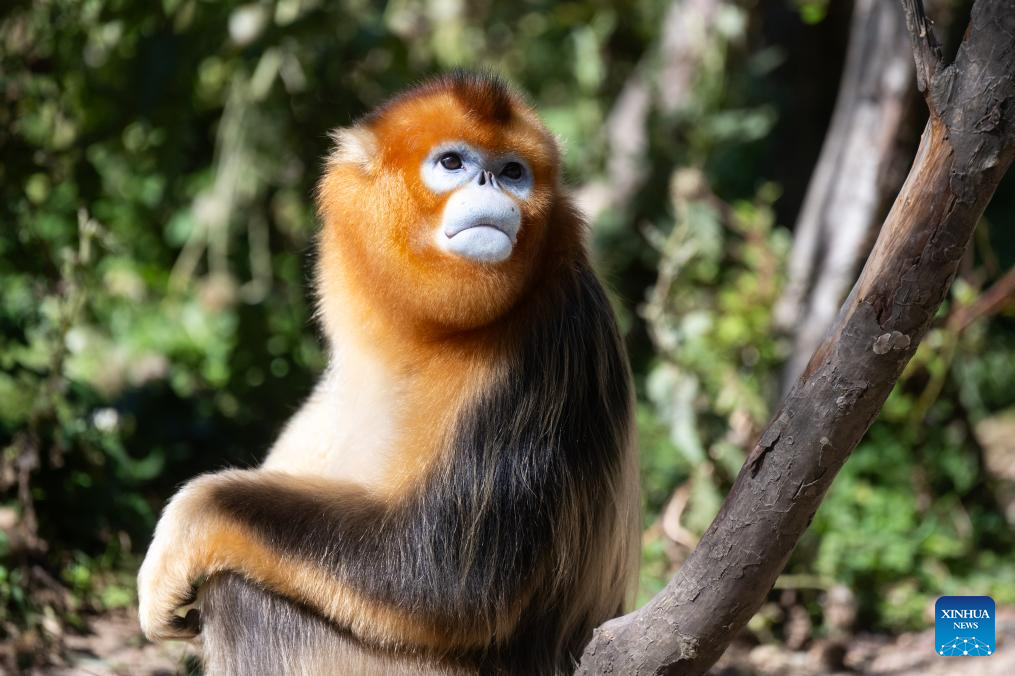 This photo taken on Aug. 15, 2024 shows a golden monkey at the Dalongtan Golden Monkey Research Center in Shennongjia National Park under the Shennongjia Forestry District, central China's Hubei Province. (Xinhua/Hui Xiaoyong)