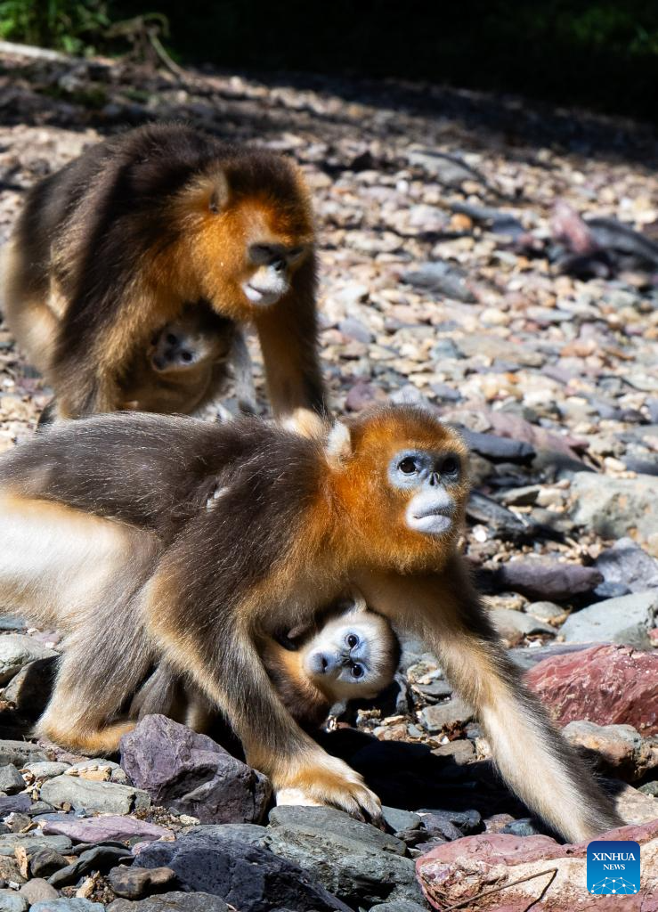 This photo taken on Aug. 15, 2024 shows golden monkeys at the Dalongtan Golden Monkey Research Center in Shennongjia National Park under the Shennongjia Forestry District, central China's Hubei Province. (Xinhua/Xiao Yijiu)