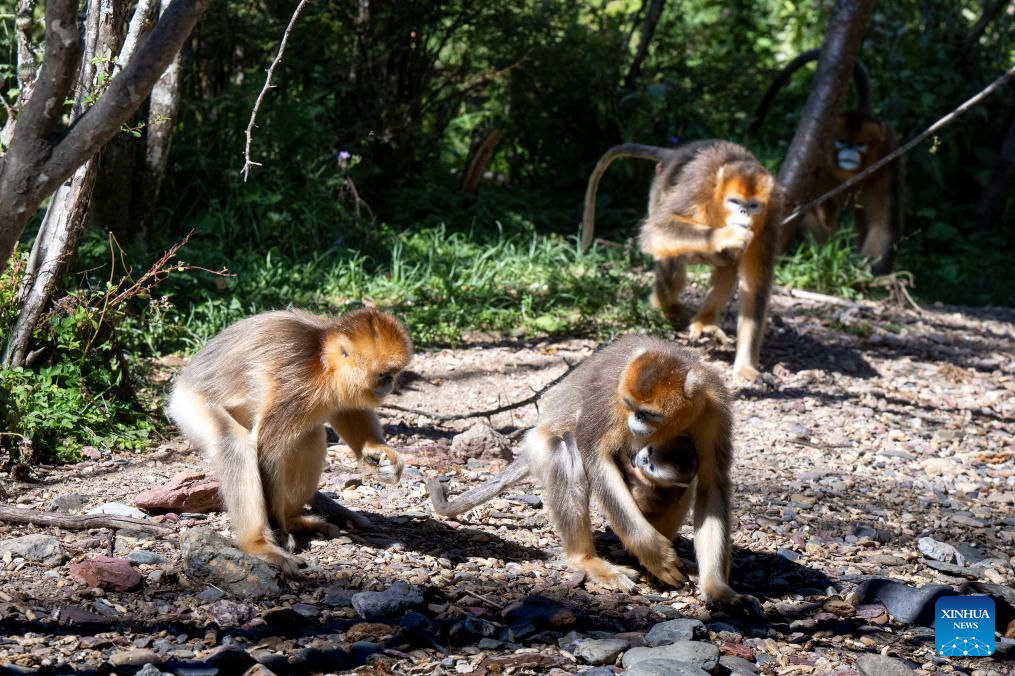 This photo taken on Aug. 15, 2024 shows golden monkeys at the Dalongtan Golden Monkey Research Center in Shennongjia National Park under the Shennongjia Forestry District, central China's Hubei Province. (Xinhua/Hui Xiaoyong)
